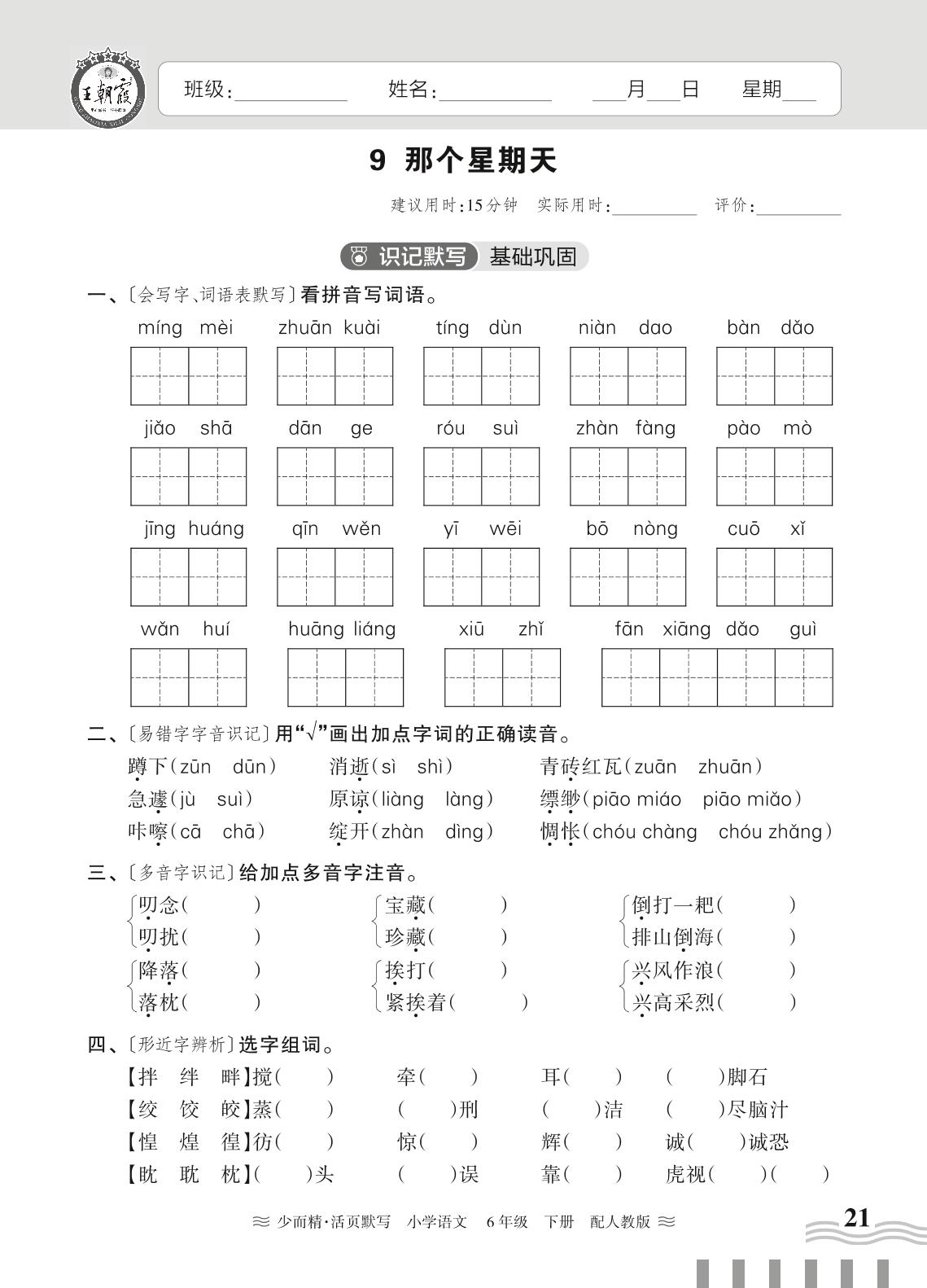 2024春下册六年级语文人教版 第三单元——9 那个星期天