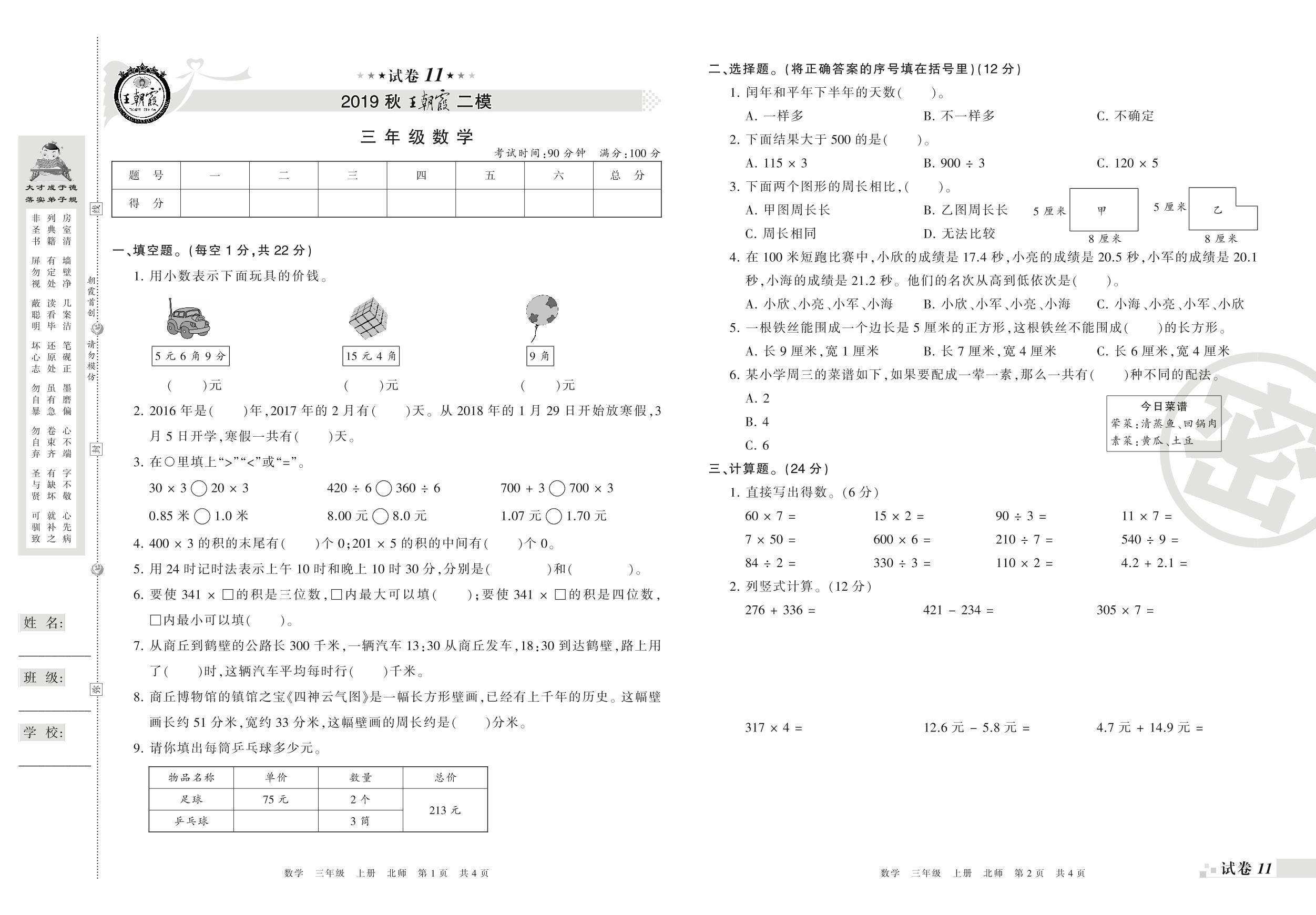 王朝霞期末模拟卷三年级上册数学(北师版)_R21080495206【11】