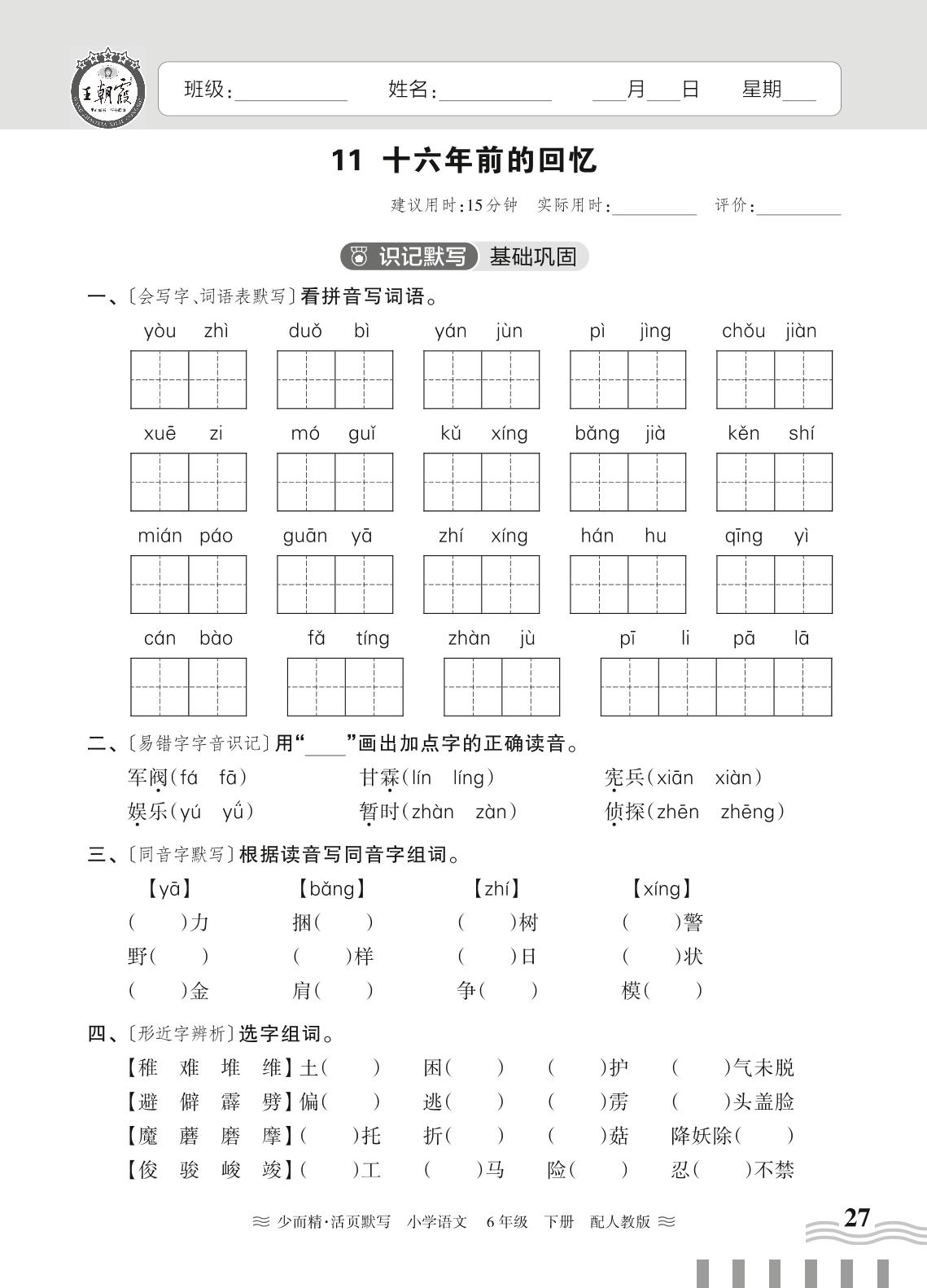 2024春下册六年级语文人教版 第四单元——11. 十六年前的回忆