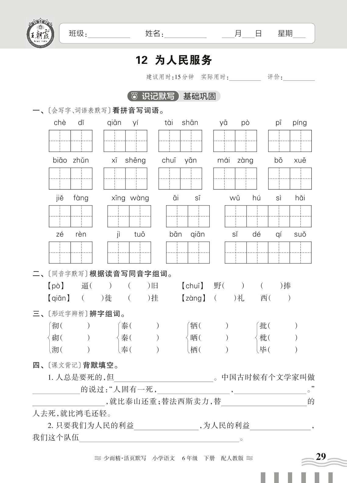 2024春下册六年级语文人教版 第四单元——12. 为人民服务