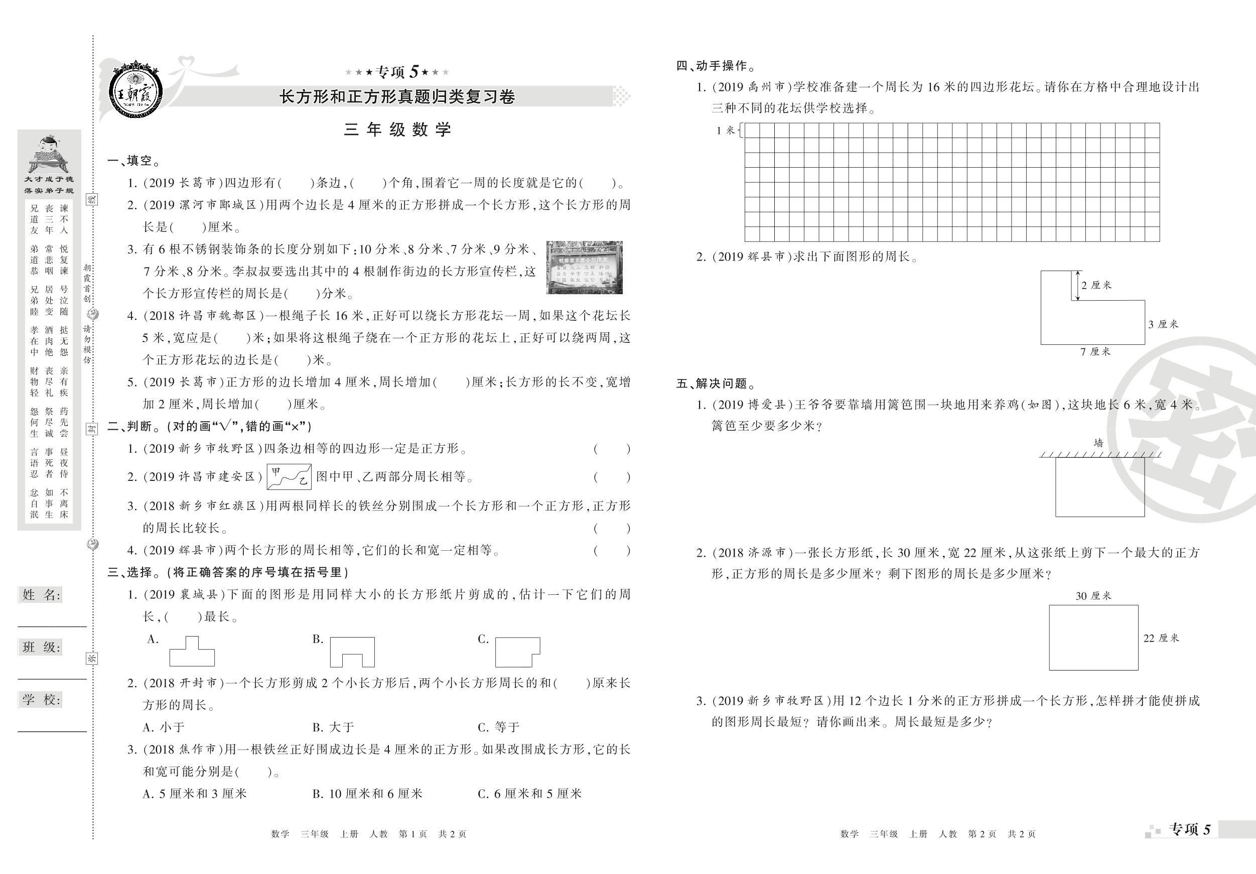 王朝霞期末专项卷——长方形和正方形、分数的初步认识真题归类复习三年级上册数学(人教版)_R21080495211【0】