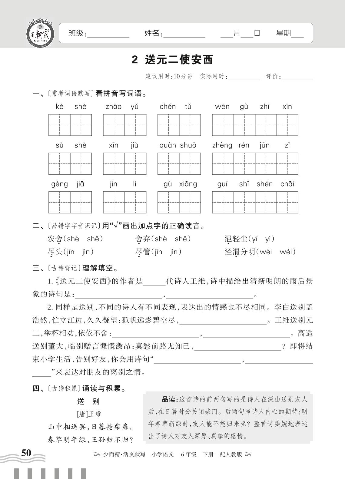 2024春下册六年级语文人教版 古诗词诵读——送元二使西安