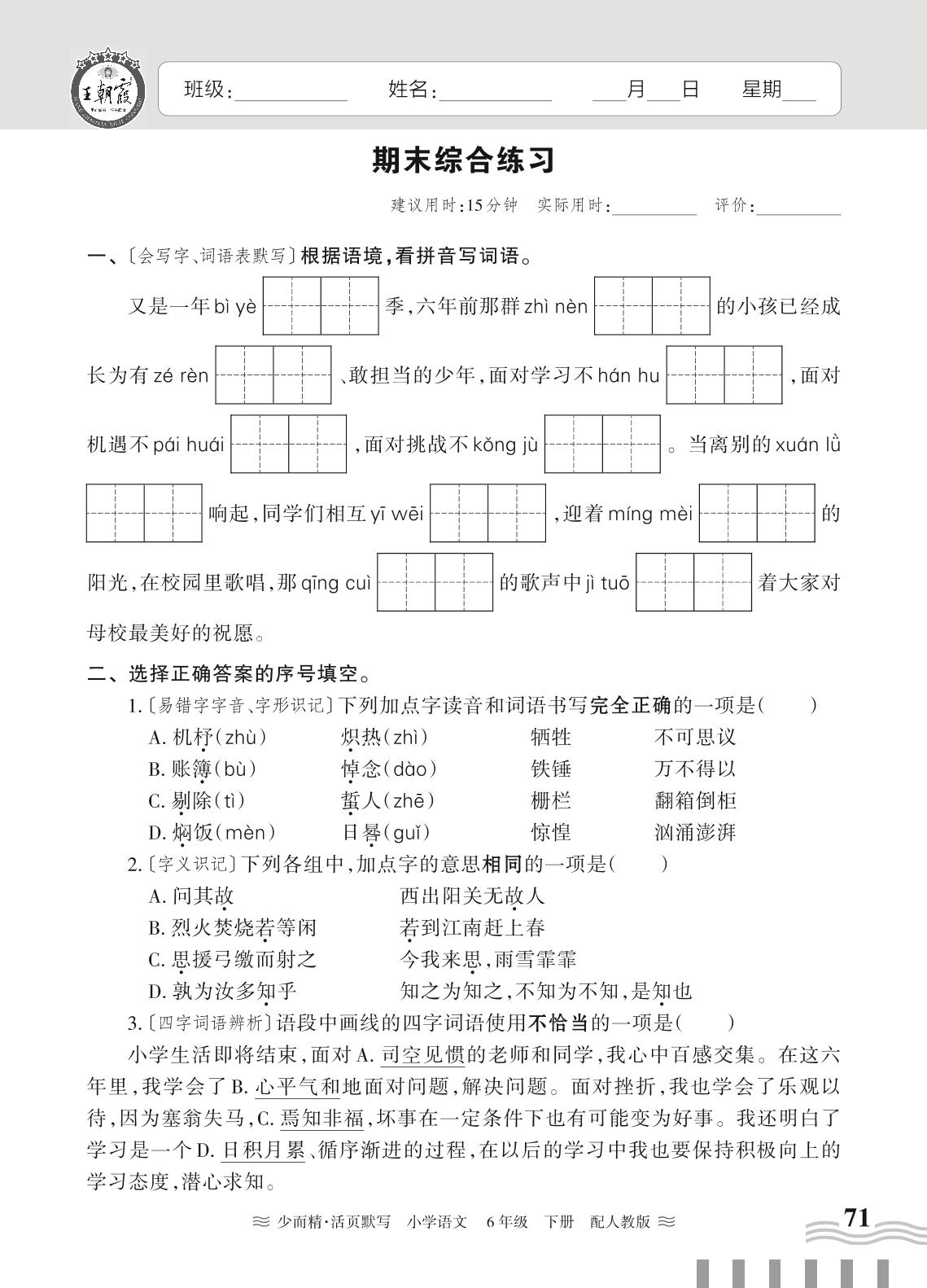 2024春下册六年级语文人教版 期末综合练习(默写专练)