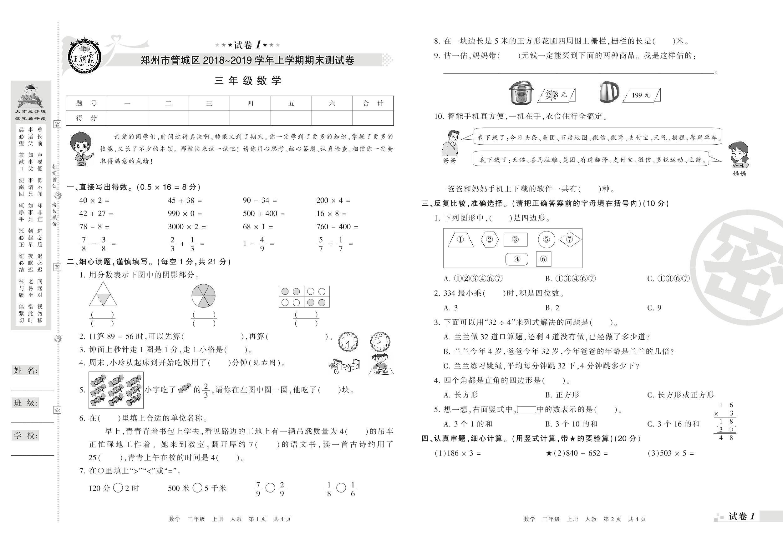 2018-2019学年第一学期郑州市管城区三年级数学试卷(人教版)【1】