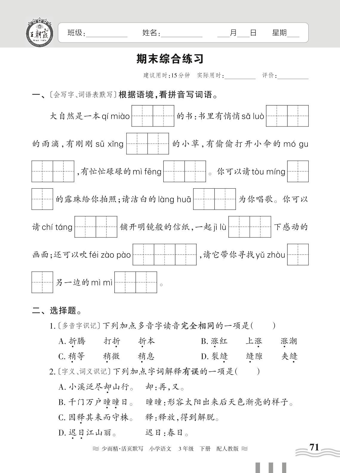 2024春下册三年级语文人教版 期末综合练习(默写专练)