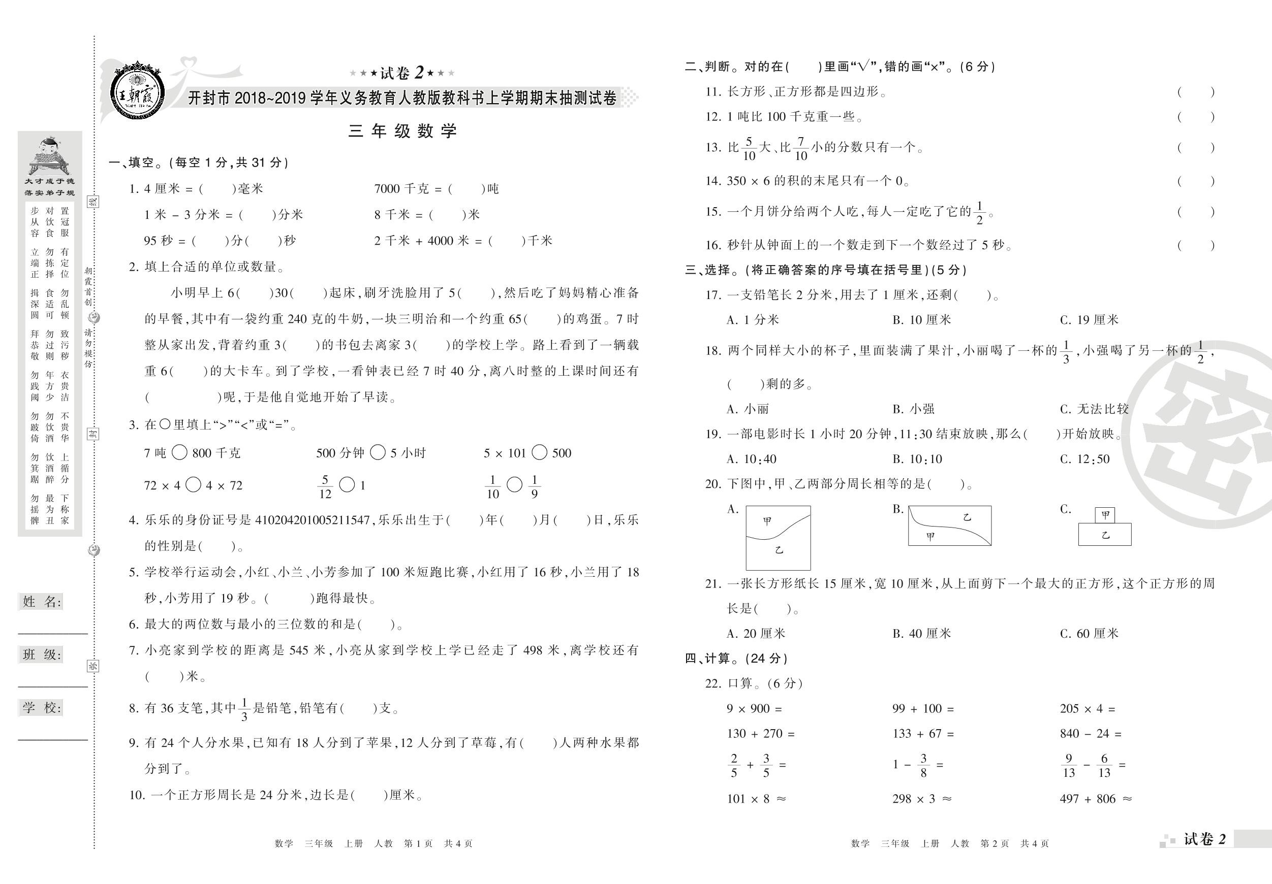 2018-2019学年第一学期开封市三年级数学试卷(人教版)【2】