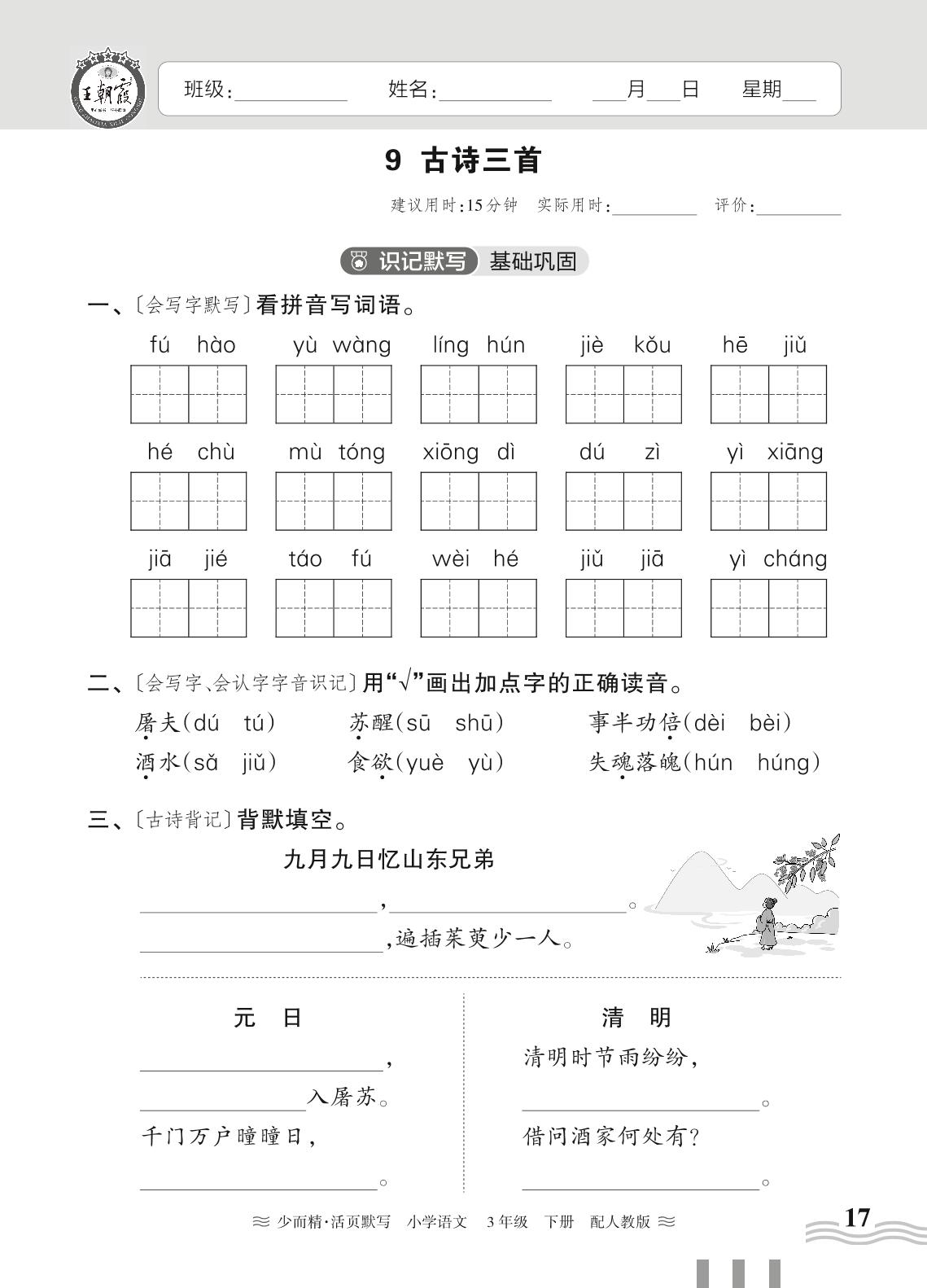 2024春下册三年级语文人教版 第三单元——9. 古诗三首