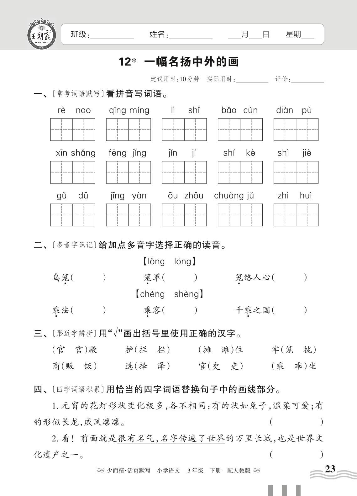 2024春下册三年级语文人教版 第三单元——12. 一幅名扬中外的画
