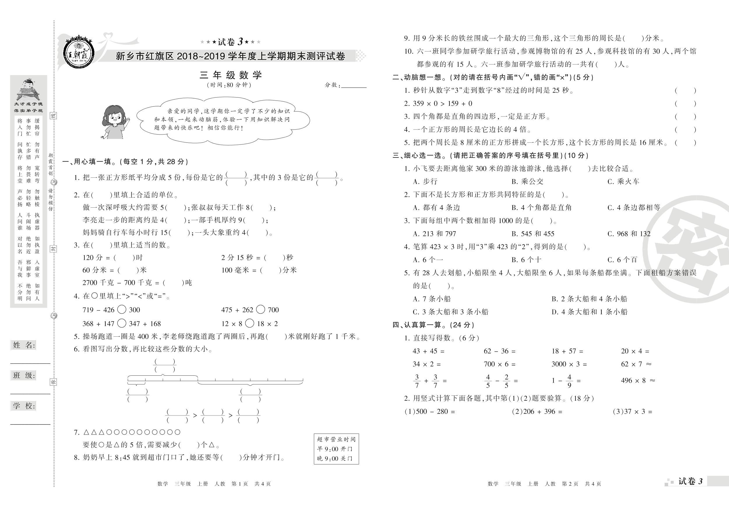 2018-2019学年第一学期新乡市红旗区三年级数学试卷(人教版)【3】