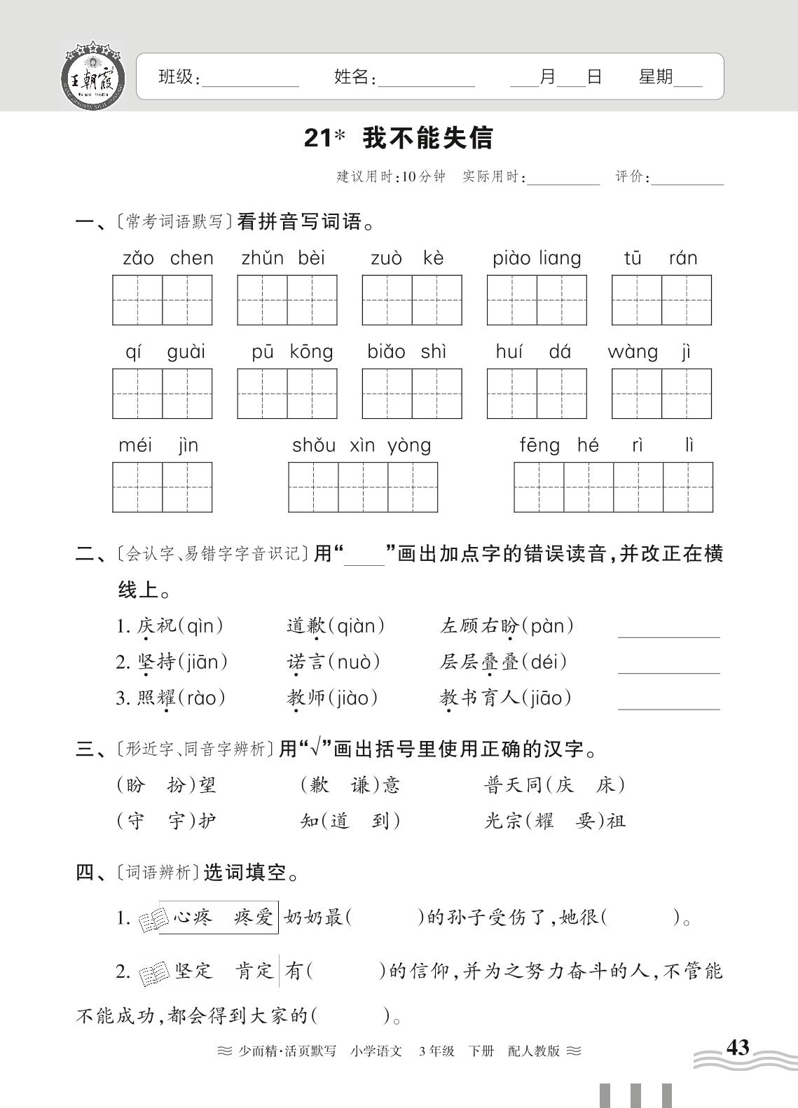 2024春下册三年级语文人教版 第六单元——21. 我不能失信