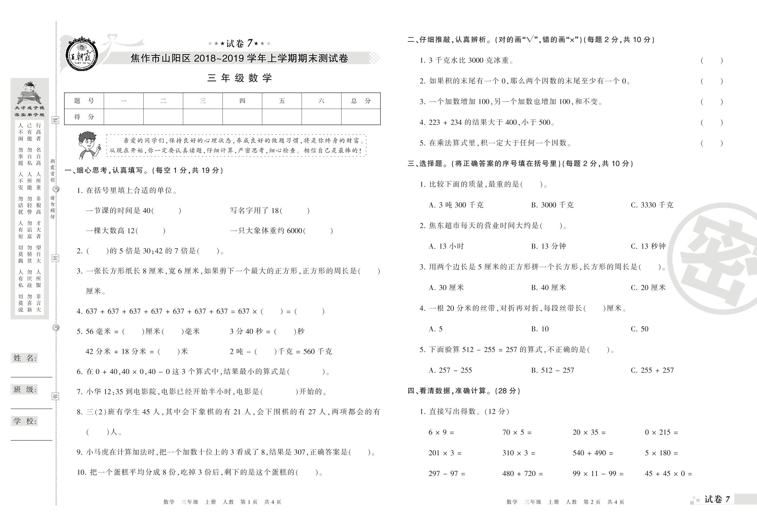 2018-2019学年第一学期焦作市山阳区三年级数学试卷(人教版)【7】