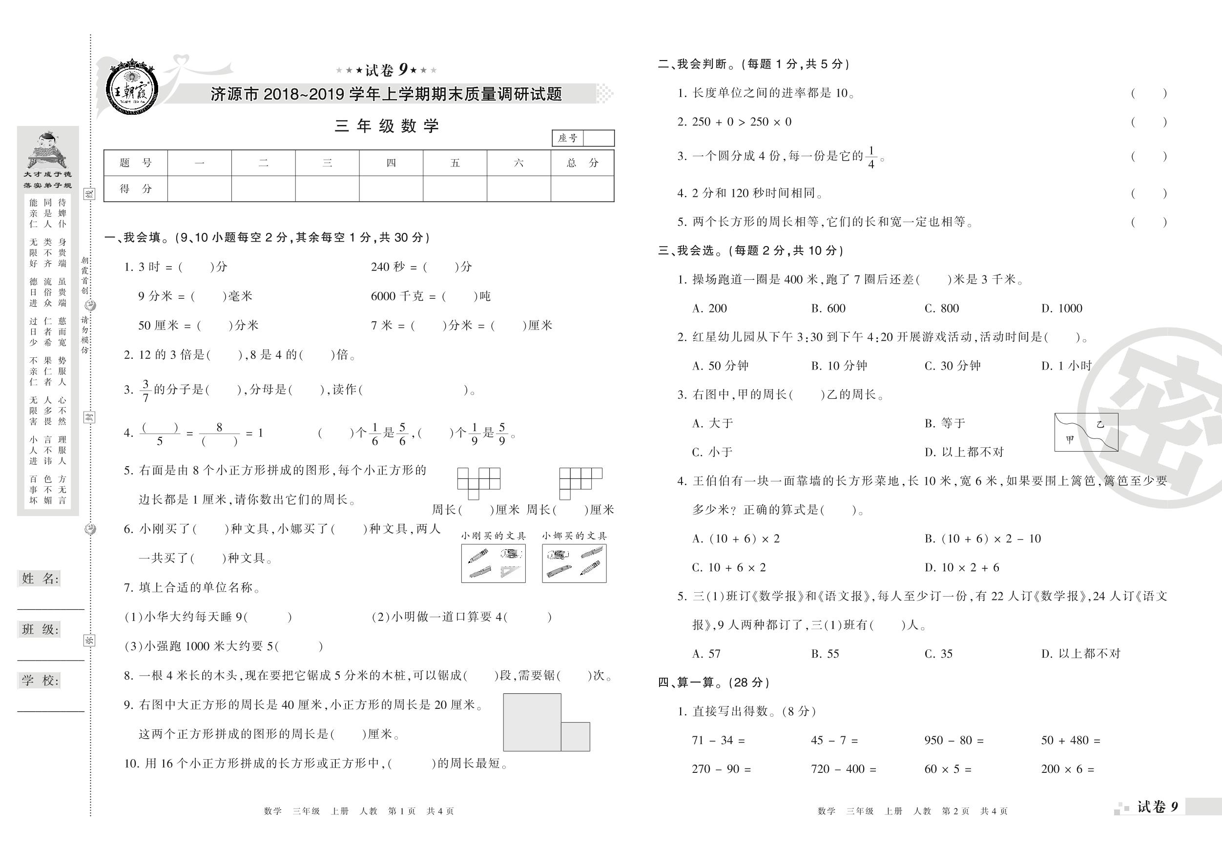 2018-2019学年第一学期济源市三年级数学试卷(人教版)【9】