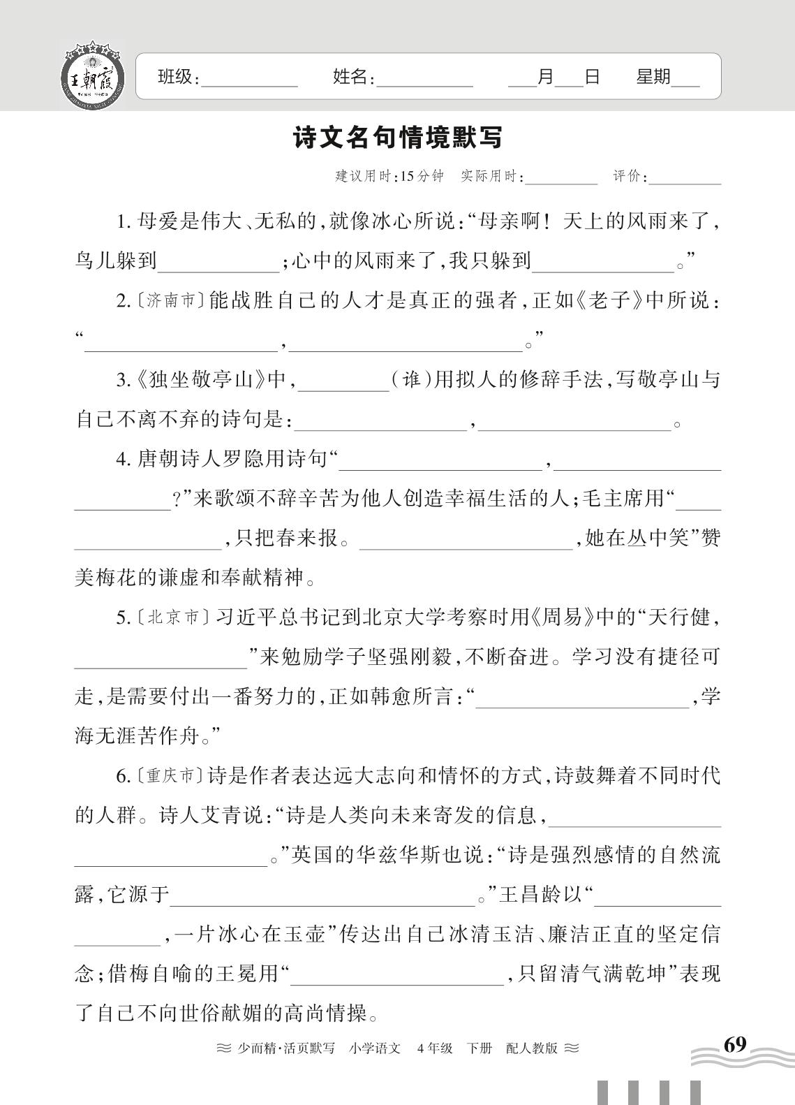 2024春下册四年级语文人教版 期末真题归类练习——诗文名句情景默写