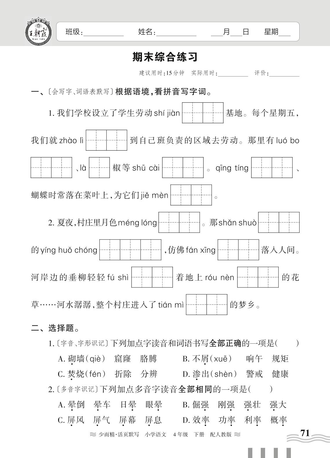 2024春下册四年级语文人教版 期末综合练习(默写专练)