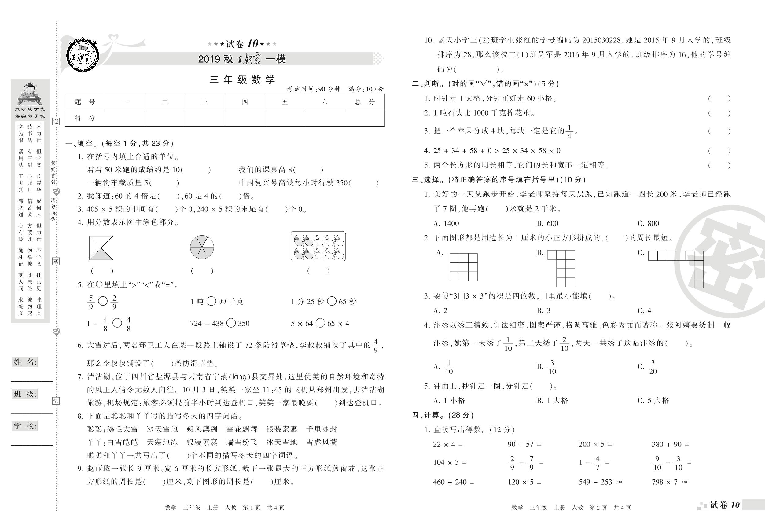 王朝霞期末模拟卷三年级上册数学(人教版)_R21080495257【10】