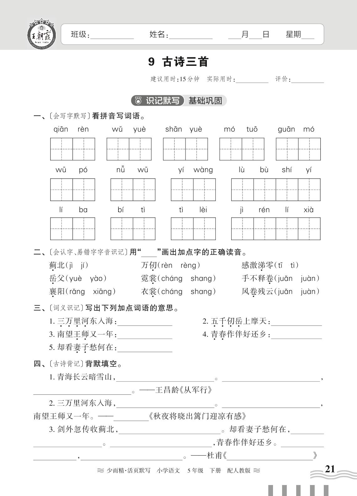 2024春下册五年级语文人教版 第四单元——9. 古诗三首