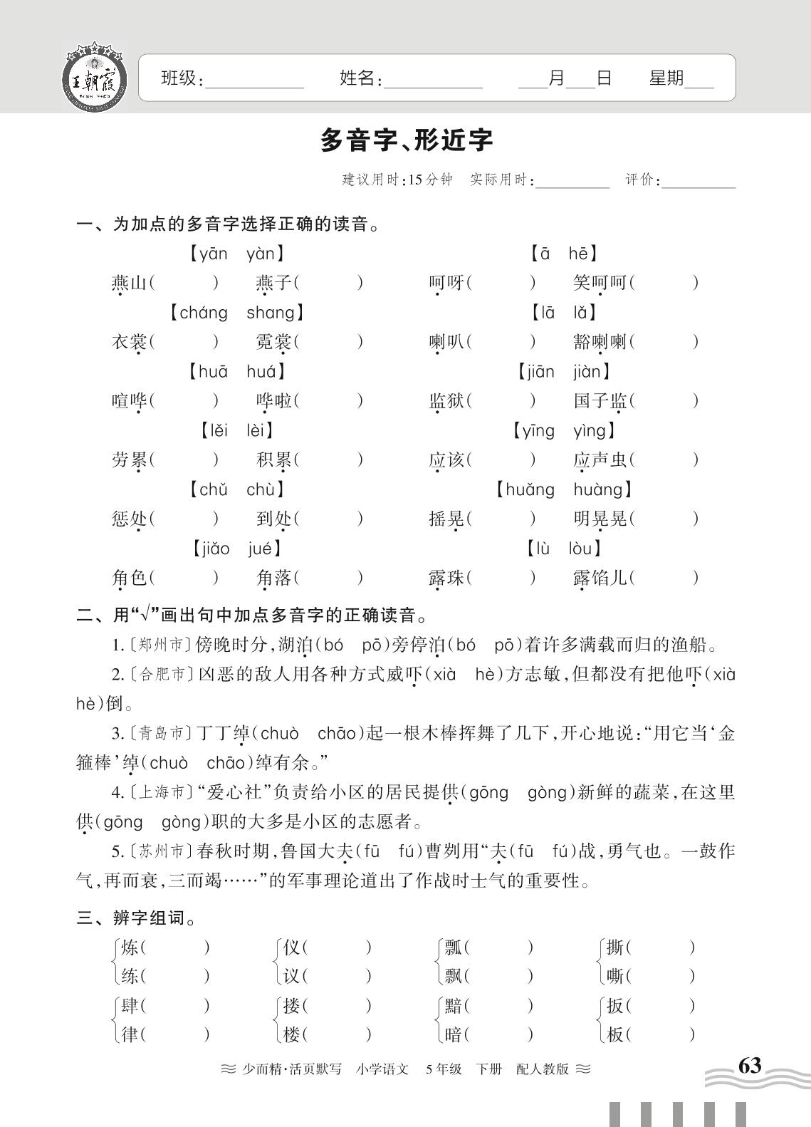 2024春下册五年级语文人教版 期末真题归类练习——多音字、形近字