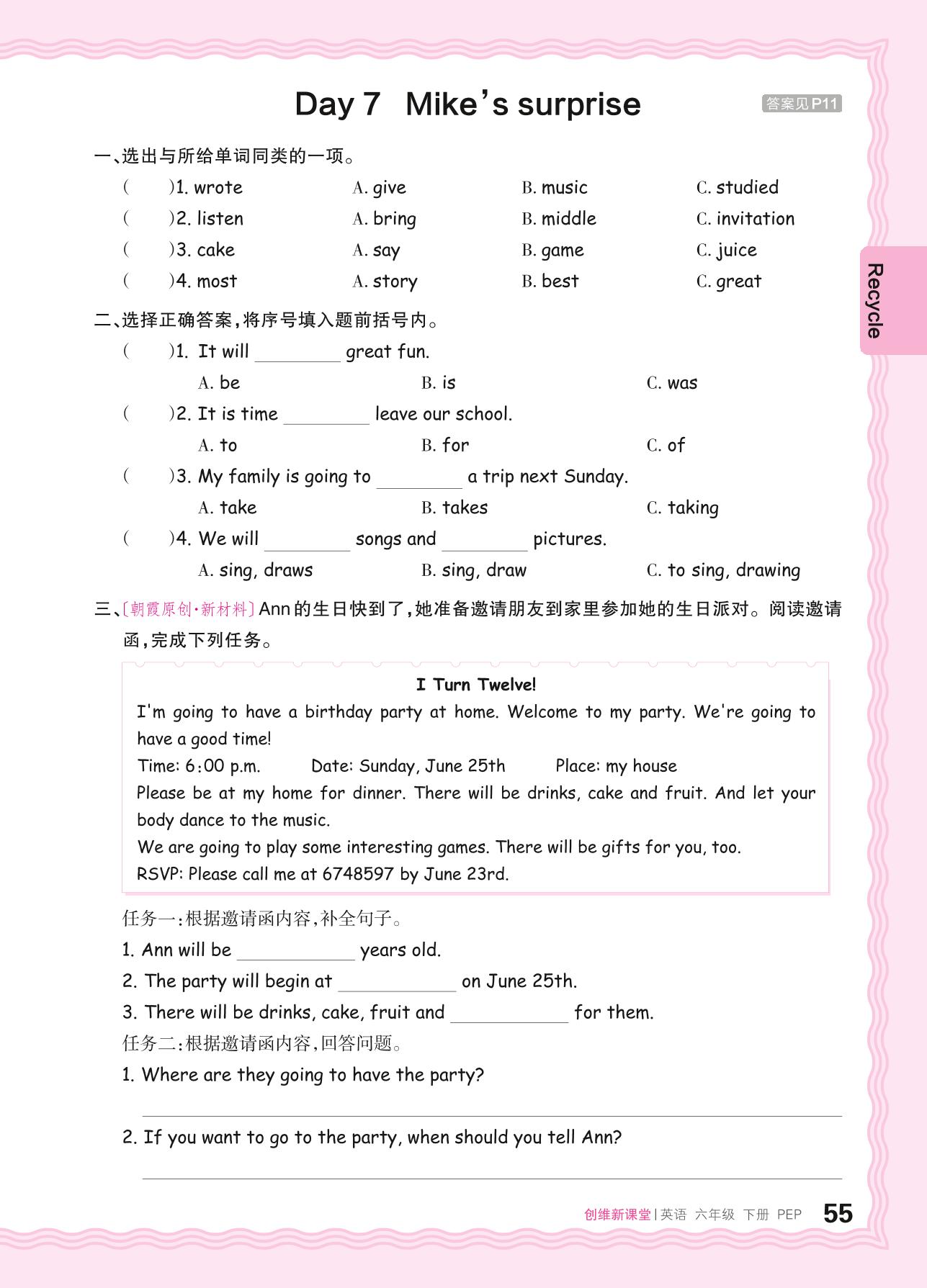 2024春下册六年级英语人教PEP版 Recycle—Day 7 Mike's surprise