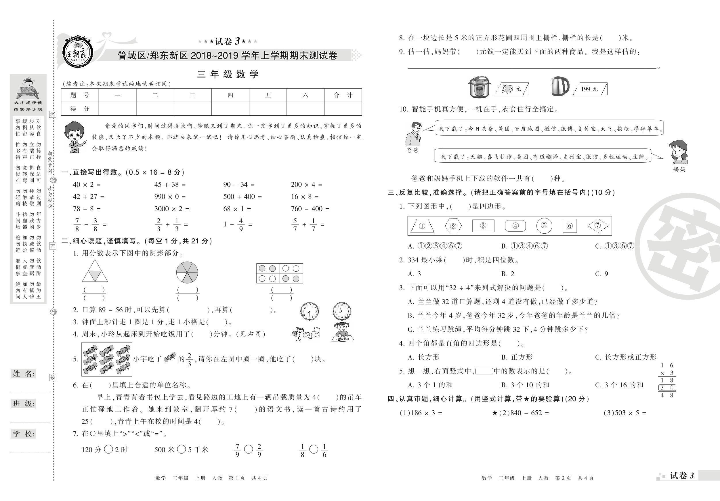 2018-2019学年第一学期郑州市管城区郑东新区三年级数学试卷(人教版)【3】