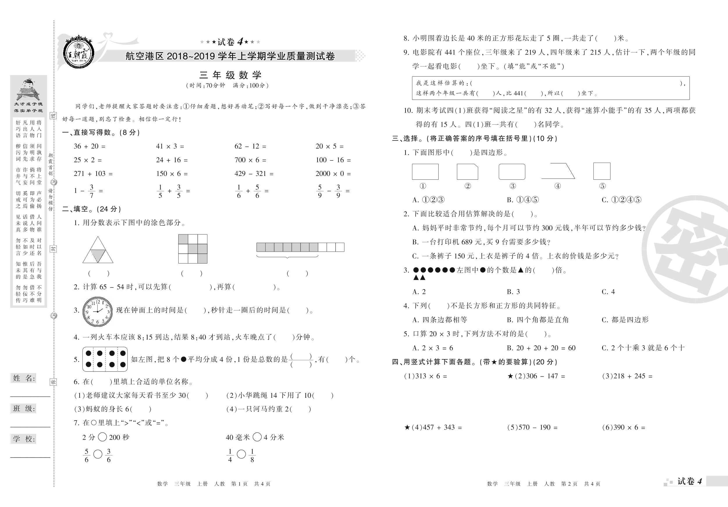 2018-2019学年第一学期郑州市航空港区三年级数学试卷(人教版)【4】