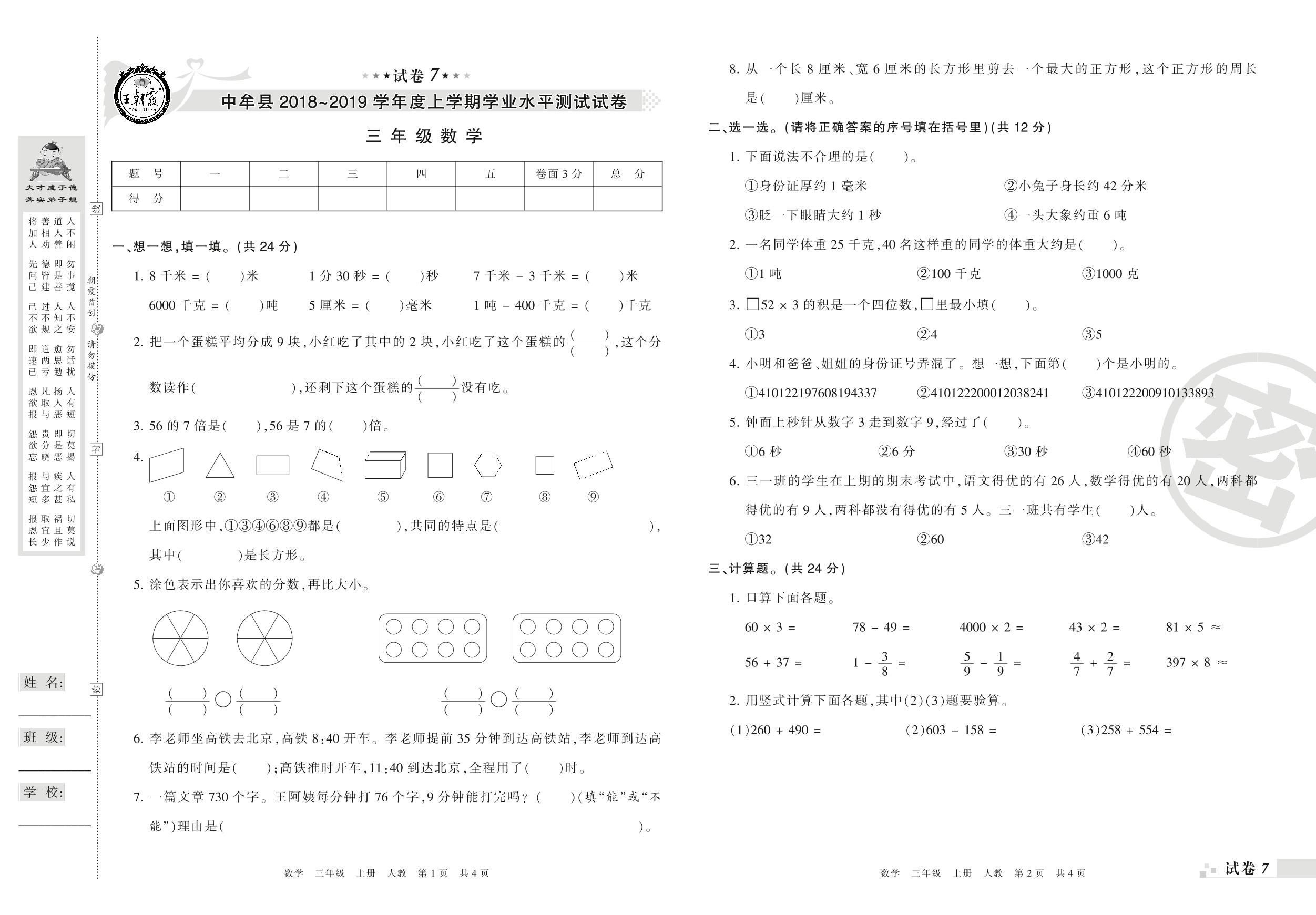 2018-2019学年第一学期郑州市中牟县三年级数学试卷(人教版)【7】