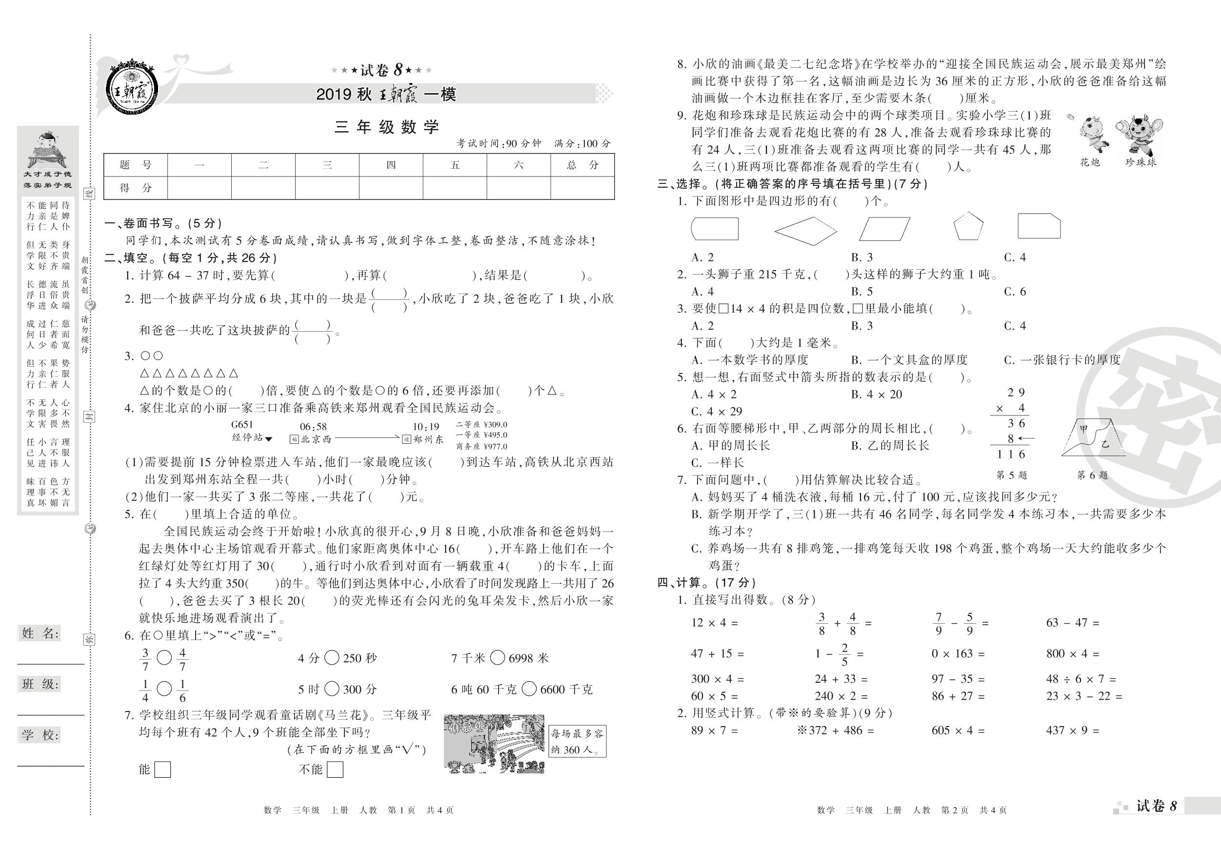 王朝霞期末模拟卷三年级上册数学(人教版)_R21080495350【8】