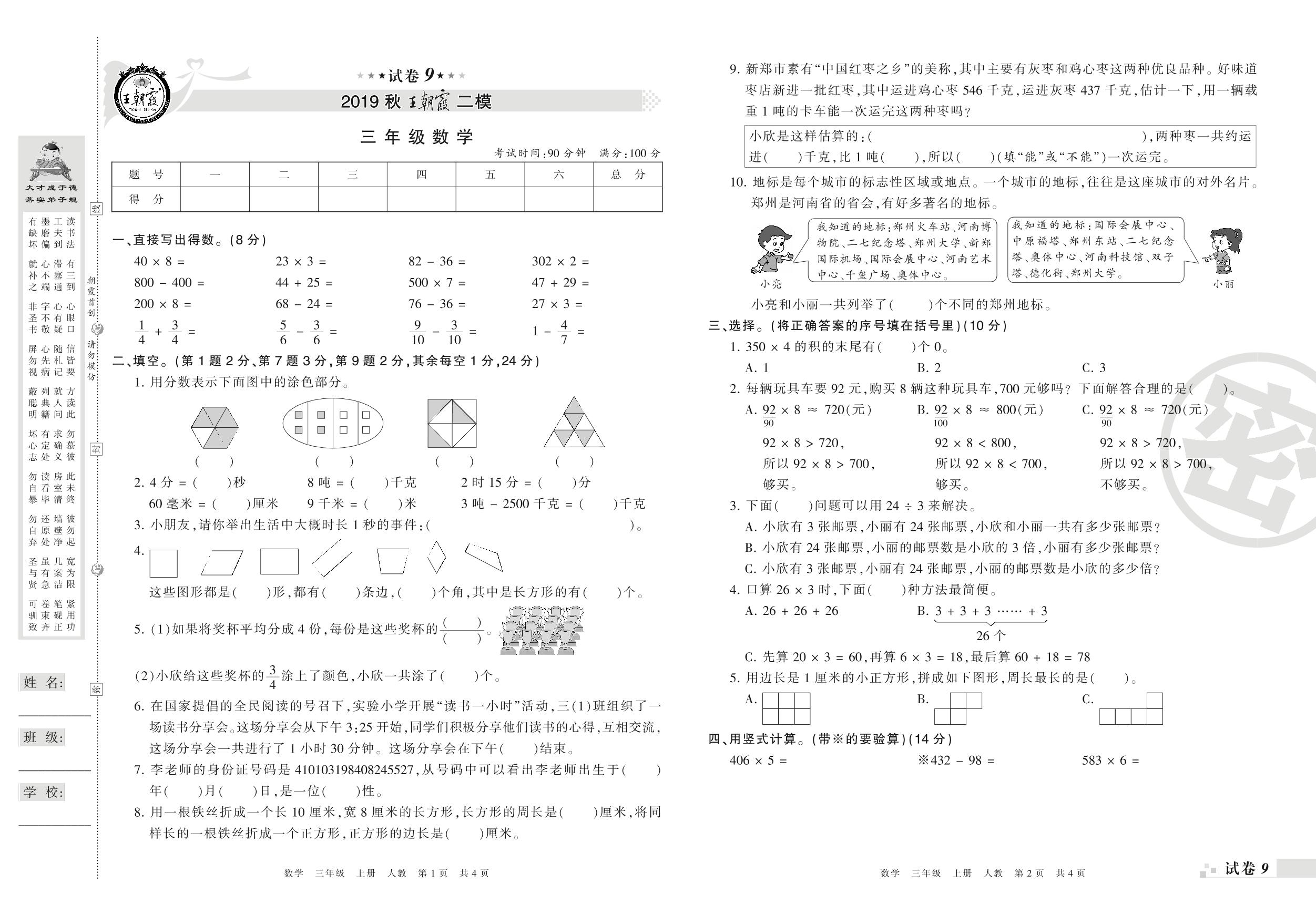 王朝霞期末模拟卷三年级上册数学(人教版)_R21080495354【9】