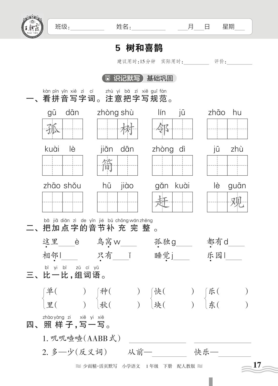 2024春下册一年级语文人教版 第三单元——5. 树和喜鹊