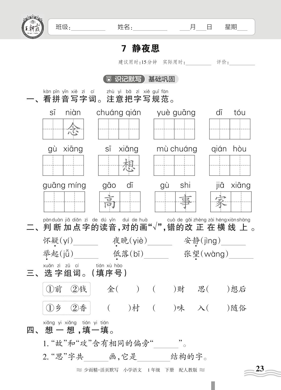 2024春下册一年级语文人教版 第四单元——7. 静夜思