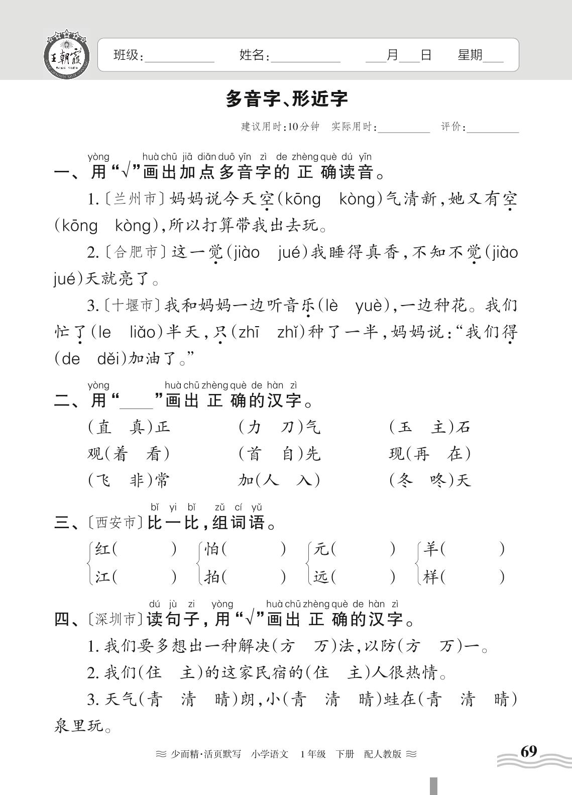 2024春下册一年级语文人教版 期末真题归类复习——多音字、形近字