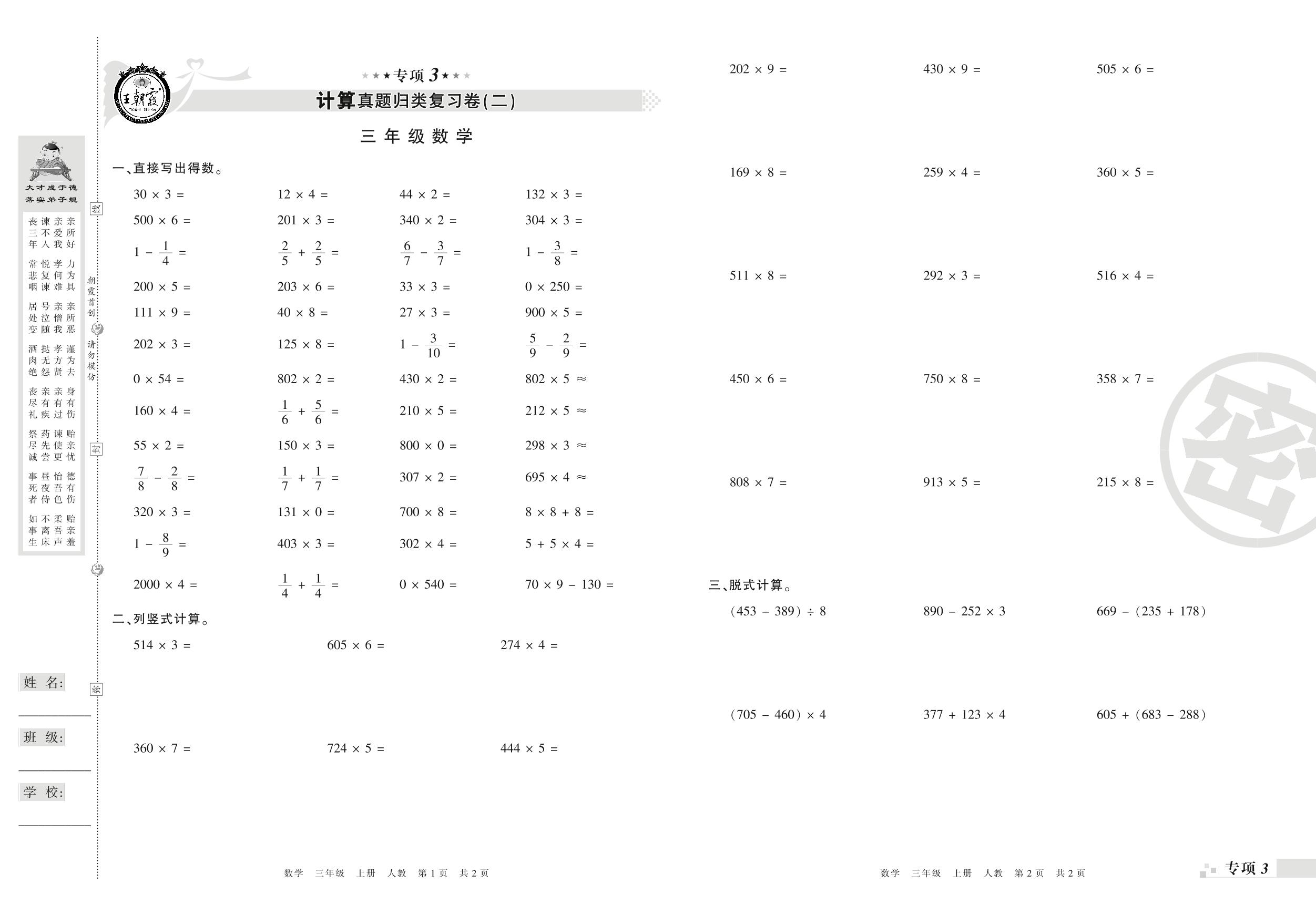 王朝霞期末专项卷——计算、解决问题三年级上册数学(人教版)_R21080495404【0】