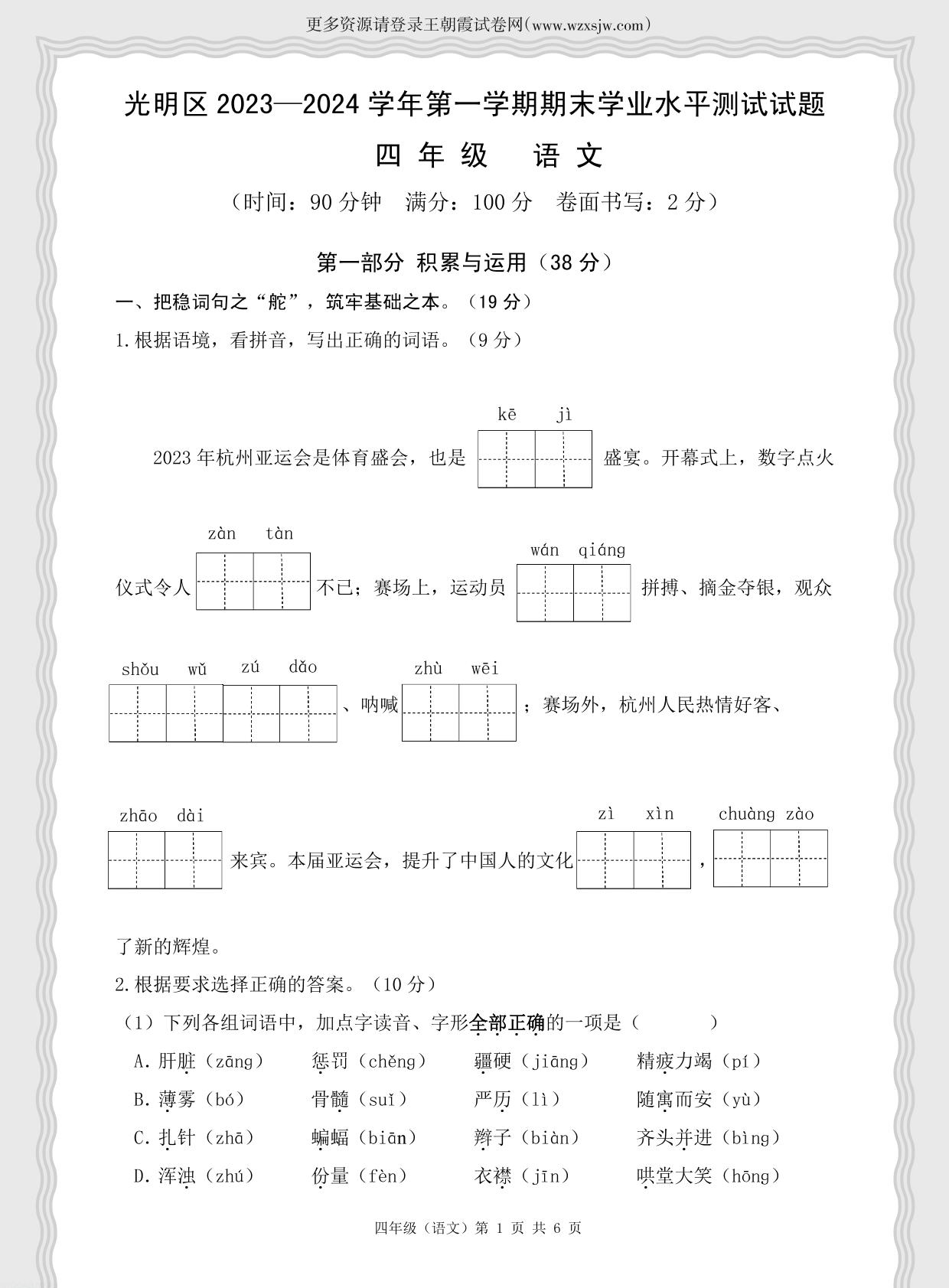 广东省深圳市光明区2023-2024学年第一学期期末学业水平测试试题四年级语文(人教版)