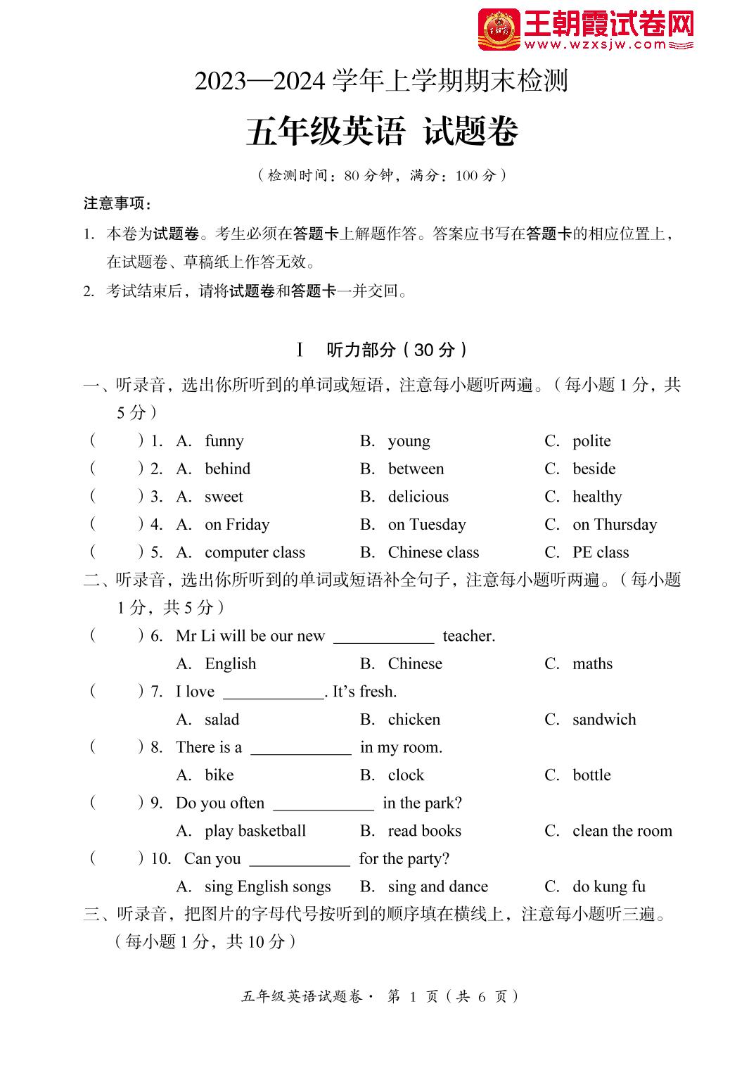 云南省昆明市九县区2023-2024学年上学期期末检测试题卷五年级英语(人教PEP版)【无听力音频】
