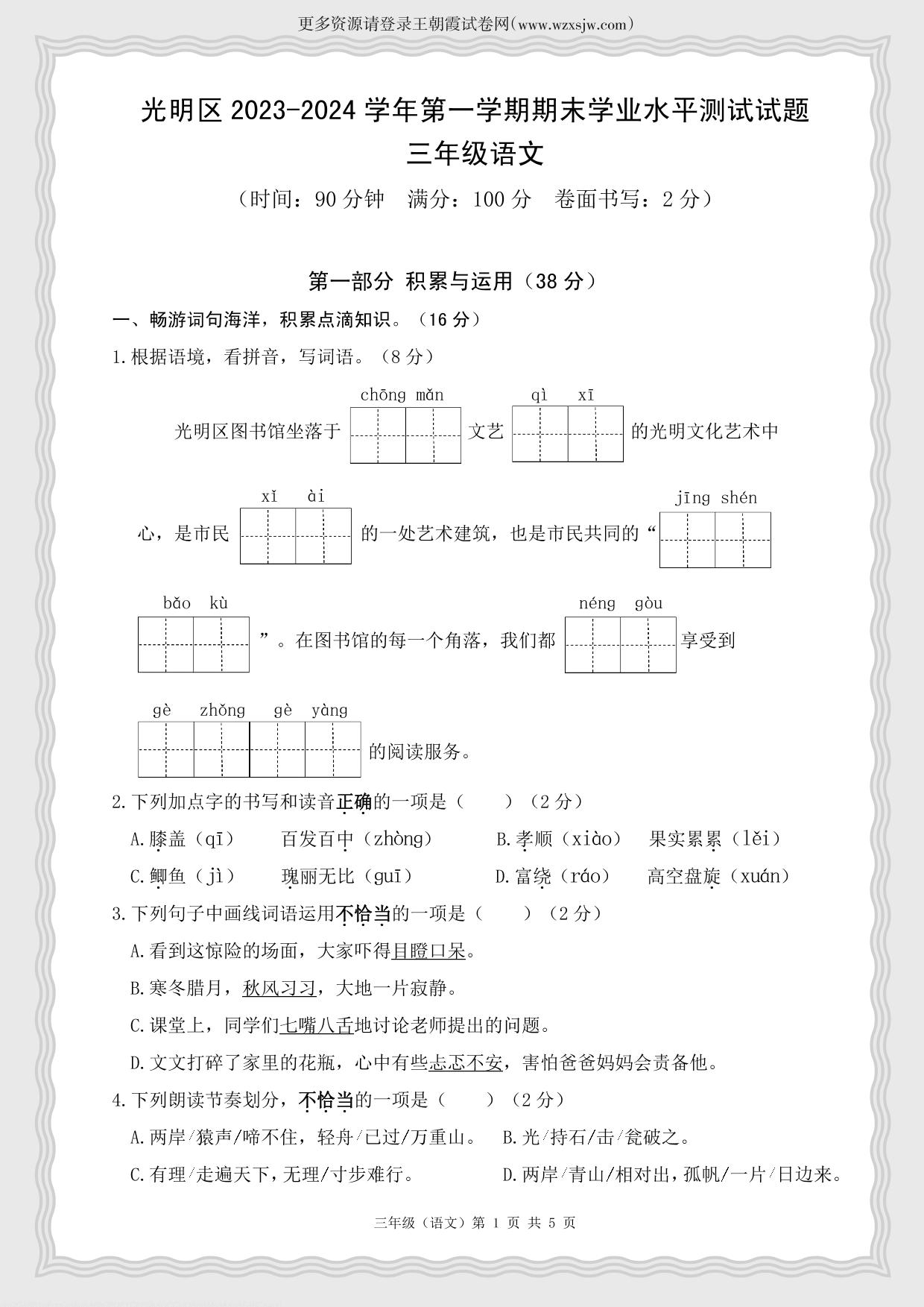 广东省深圳市光明区2023-2024学年第一学期期末学业水平测试试题三年级语文(人教版)