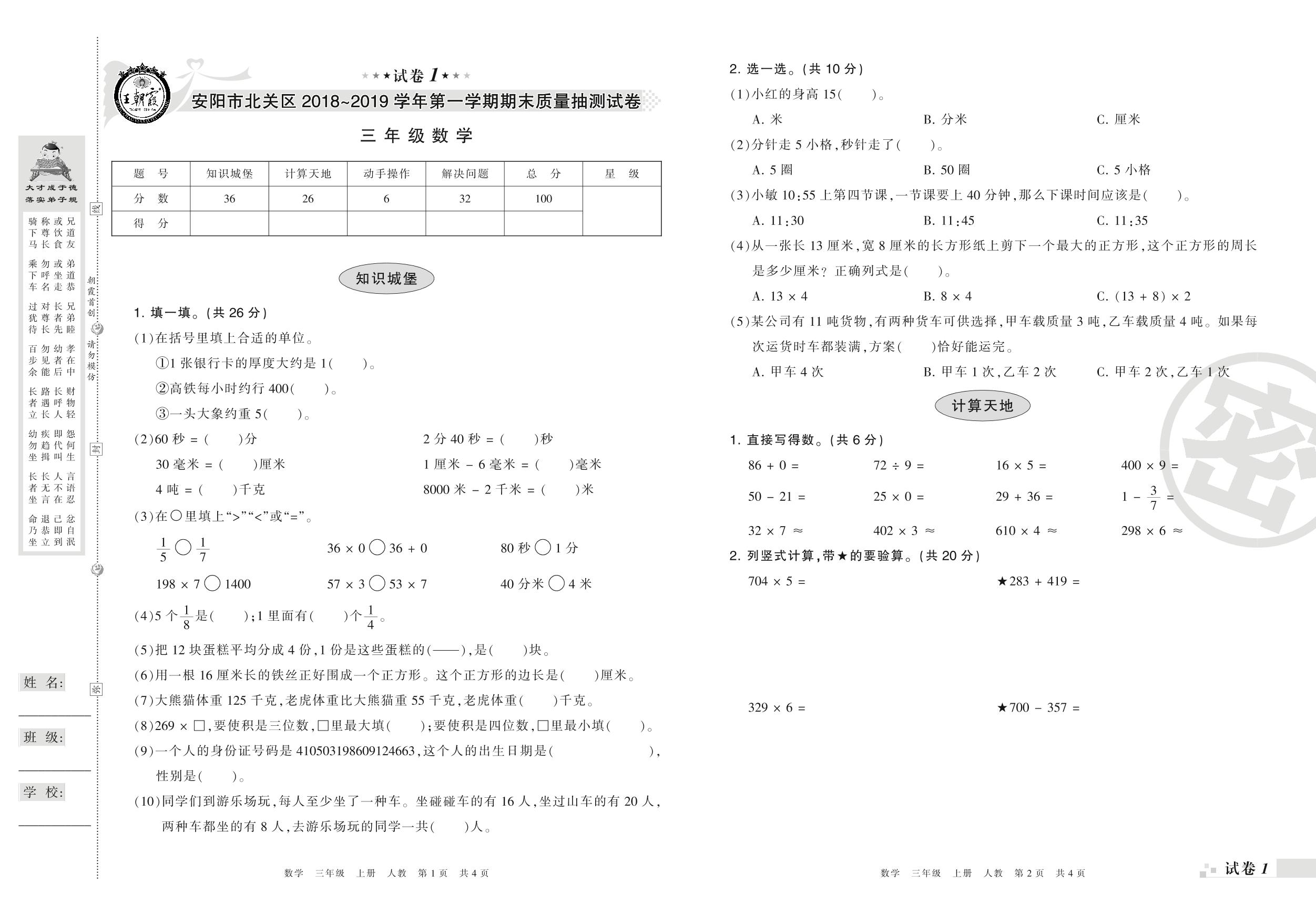 2018-2019学年第一学期安阳市北关区三年级数学试卷(人教版)【1】