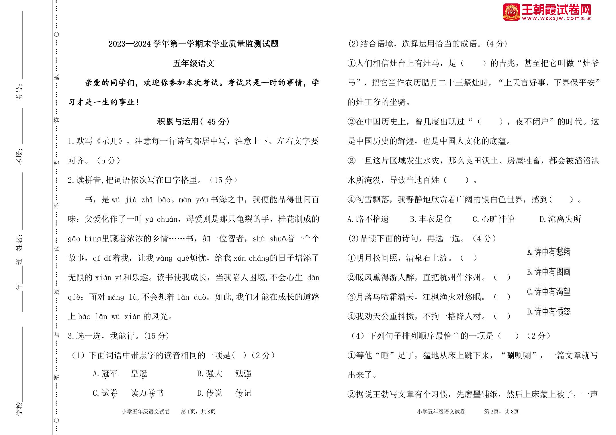内蒙古自治区赤峰市巴林左旗2023-2024学年第一学期期末学业质量监测试题五年级语文(人教版)