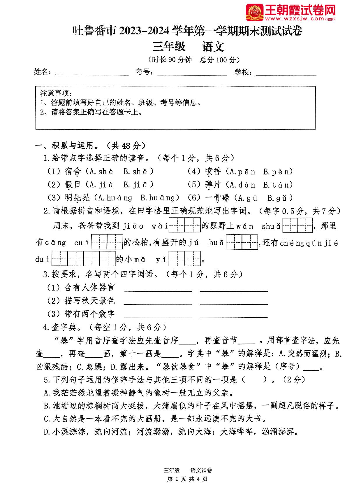 新疆维吾尔自治区吐鲁番市2023-2024学年第一学期期末测试试卷三年级语文(人教版)