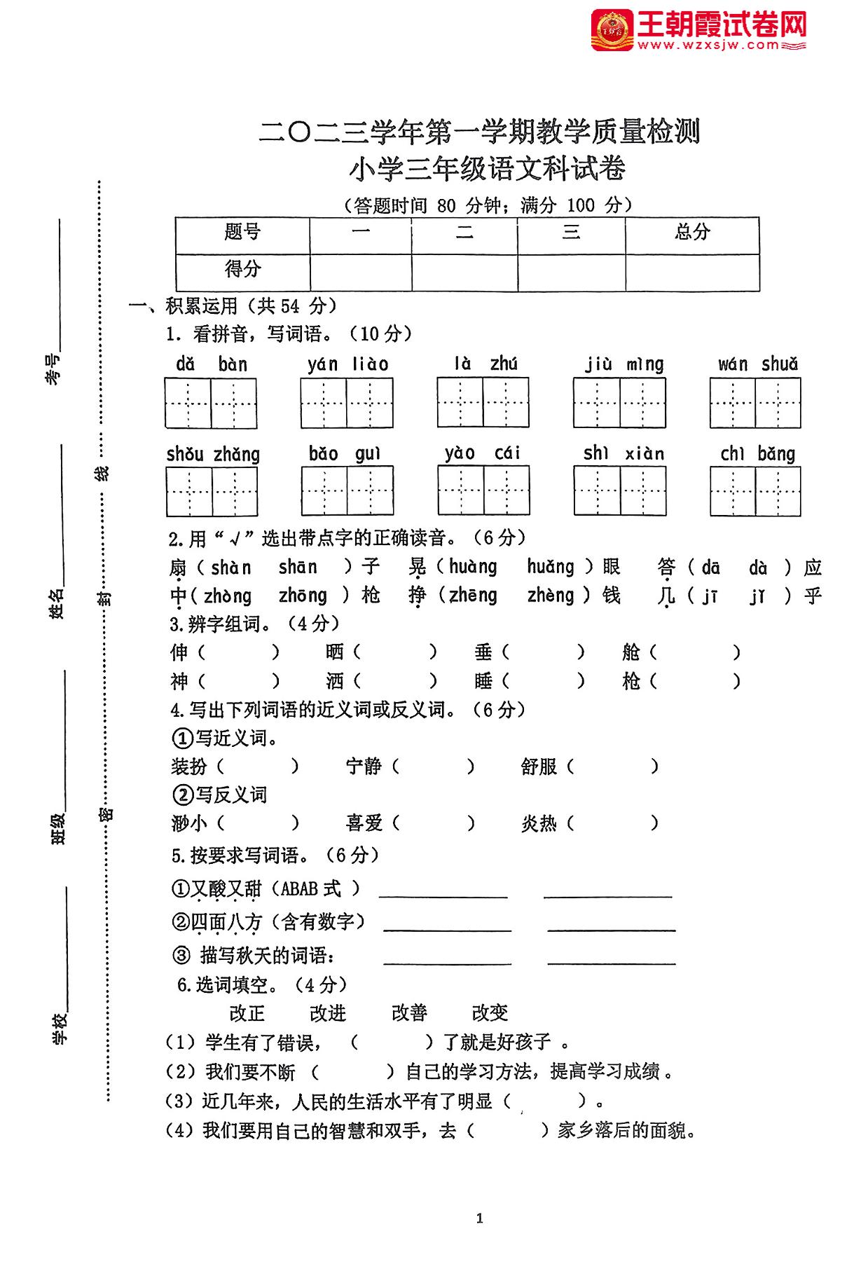 广东省肇庆市四会市城中街道九校2023-2024学年第一学期期末教学质量检测试卷三年级语文(人教版)