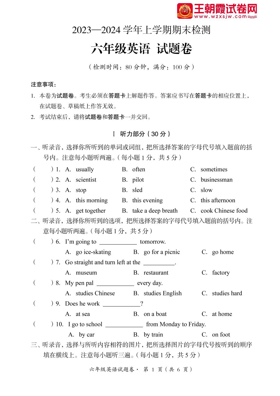 云南省昆明市九县区2023-2024学年上学期期末检测试题卷六年级英语(人教PEP版)【无听力音频】