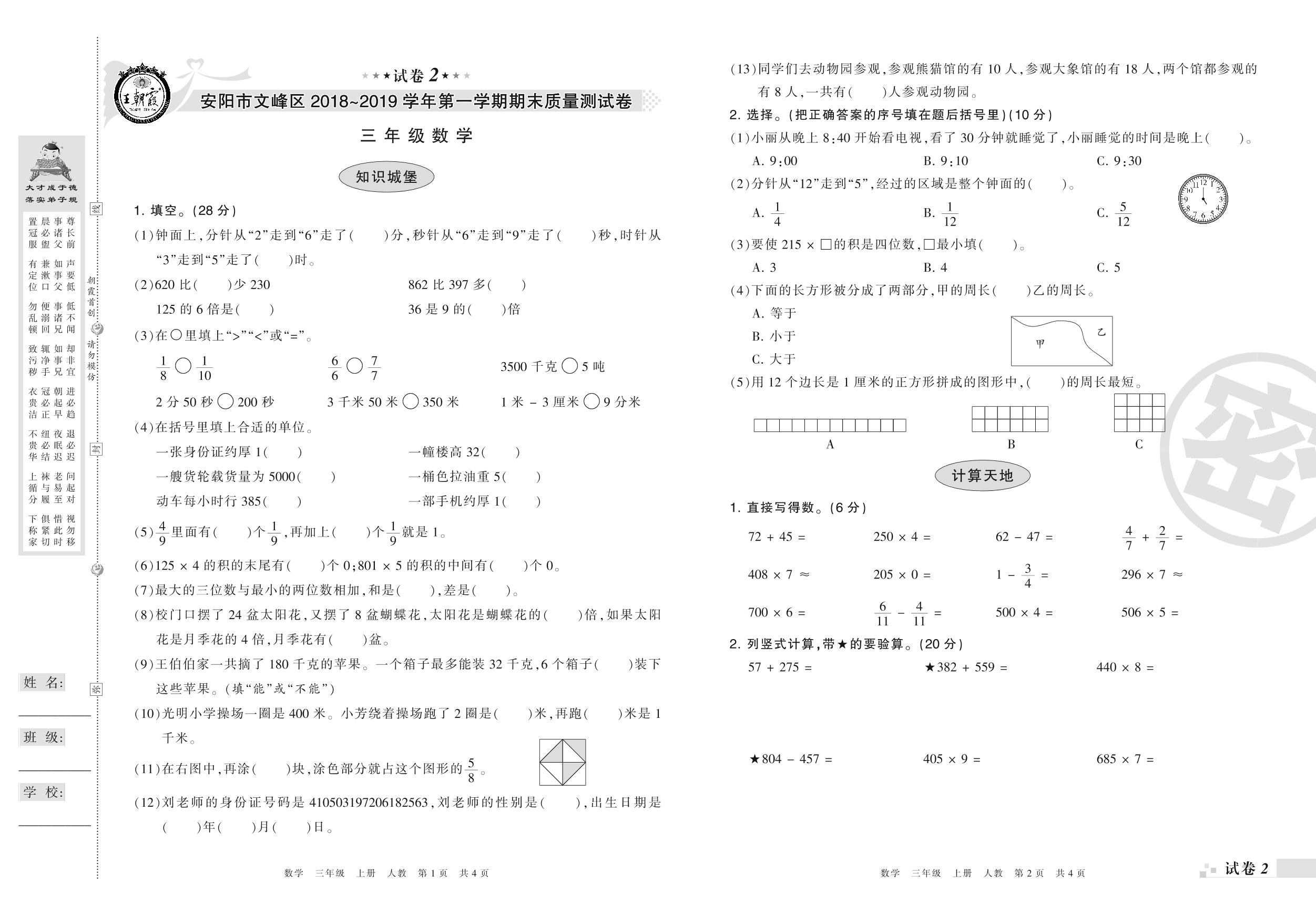 2018-2019学年第一学期安阳市文峰区三年级数学试卷(人教版)【2】