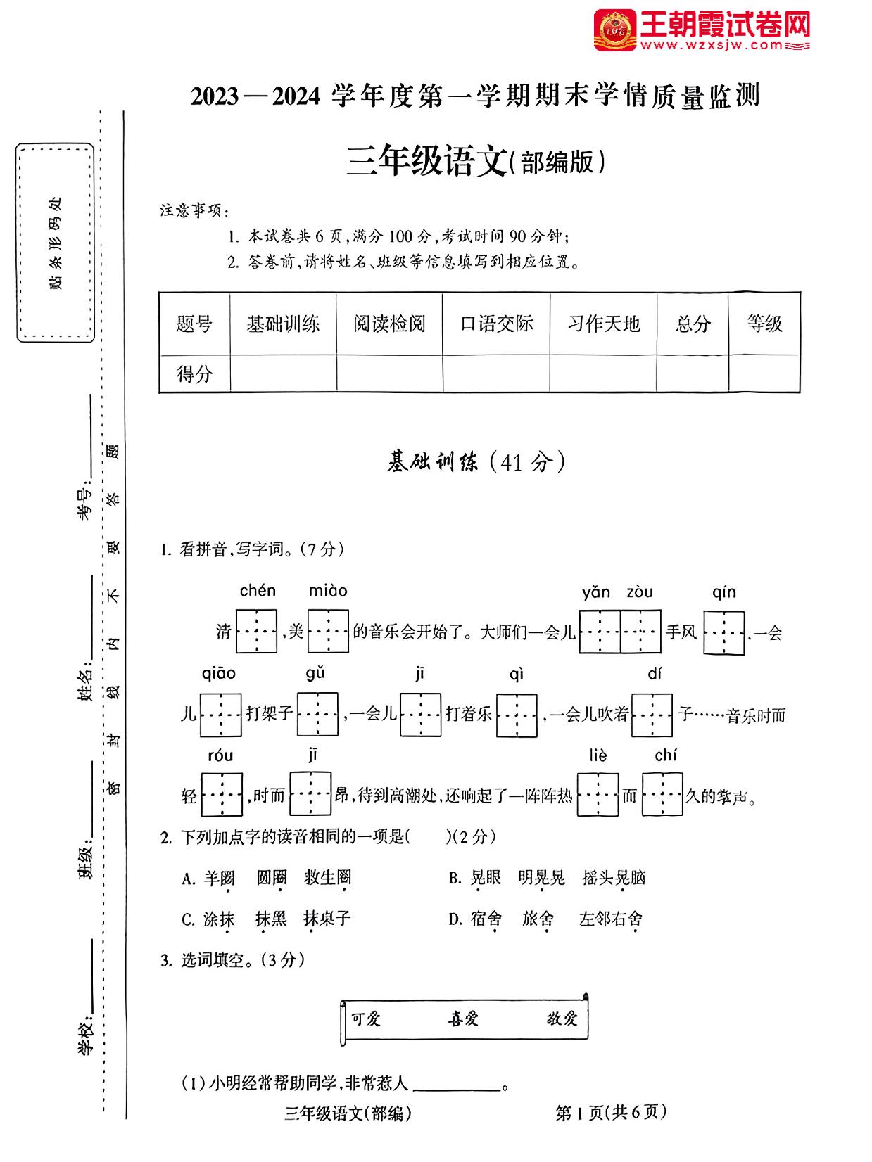 山西省朔州市怀仁市新桥小学2023-2024学年度第一学期期末学情质量监测试卷三年级语文(人教版)