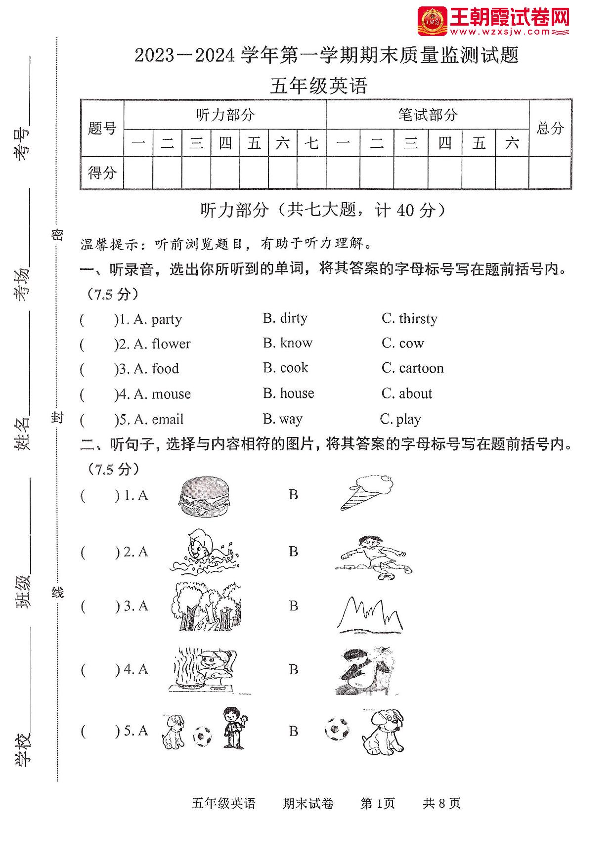 河北省承德市兴隆县2023-2024学年第一学期期末质量监测试题五年级英语(人教PEP版)【无听力音频】