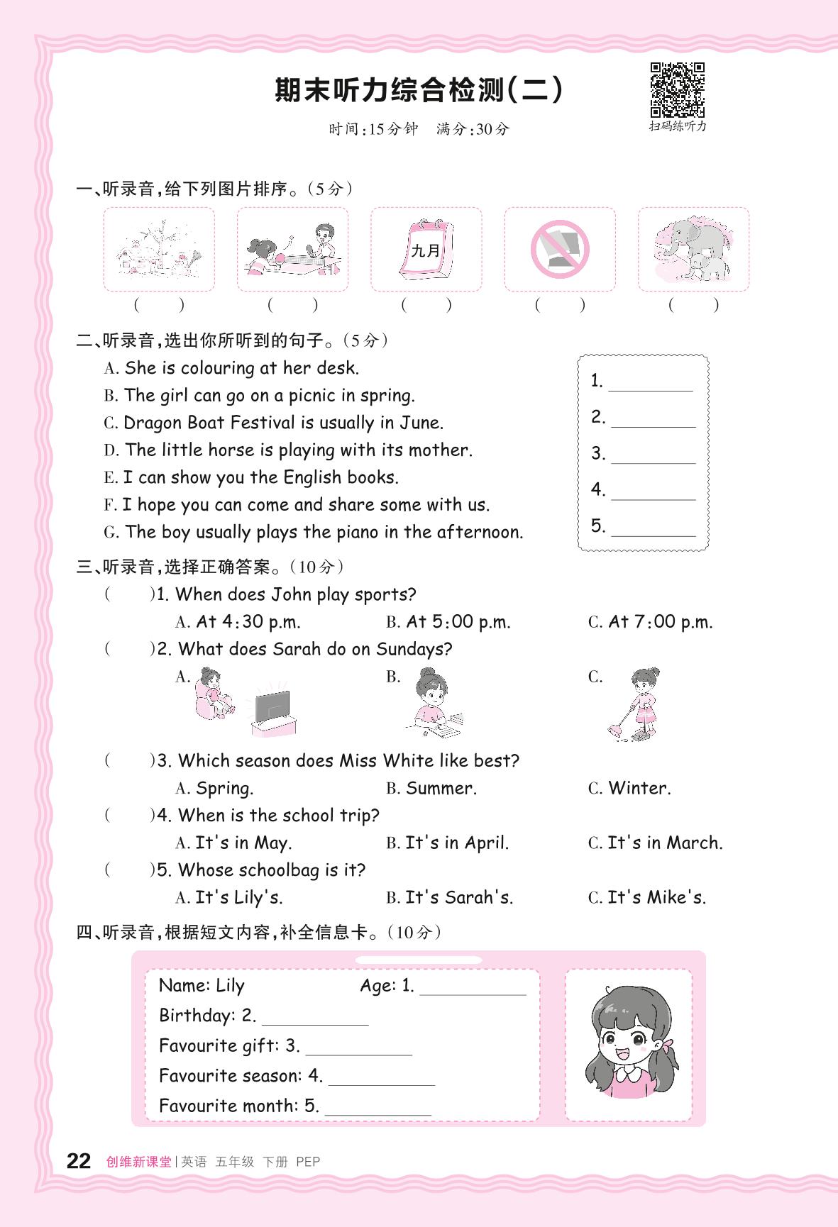2024春下册五年级英语人教PEP版 期末听力综合检测(二)