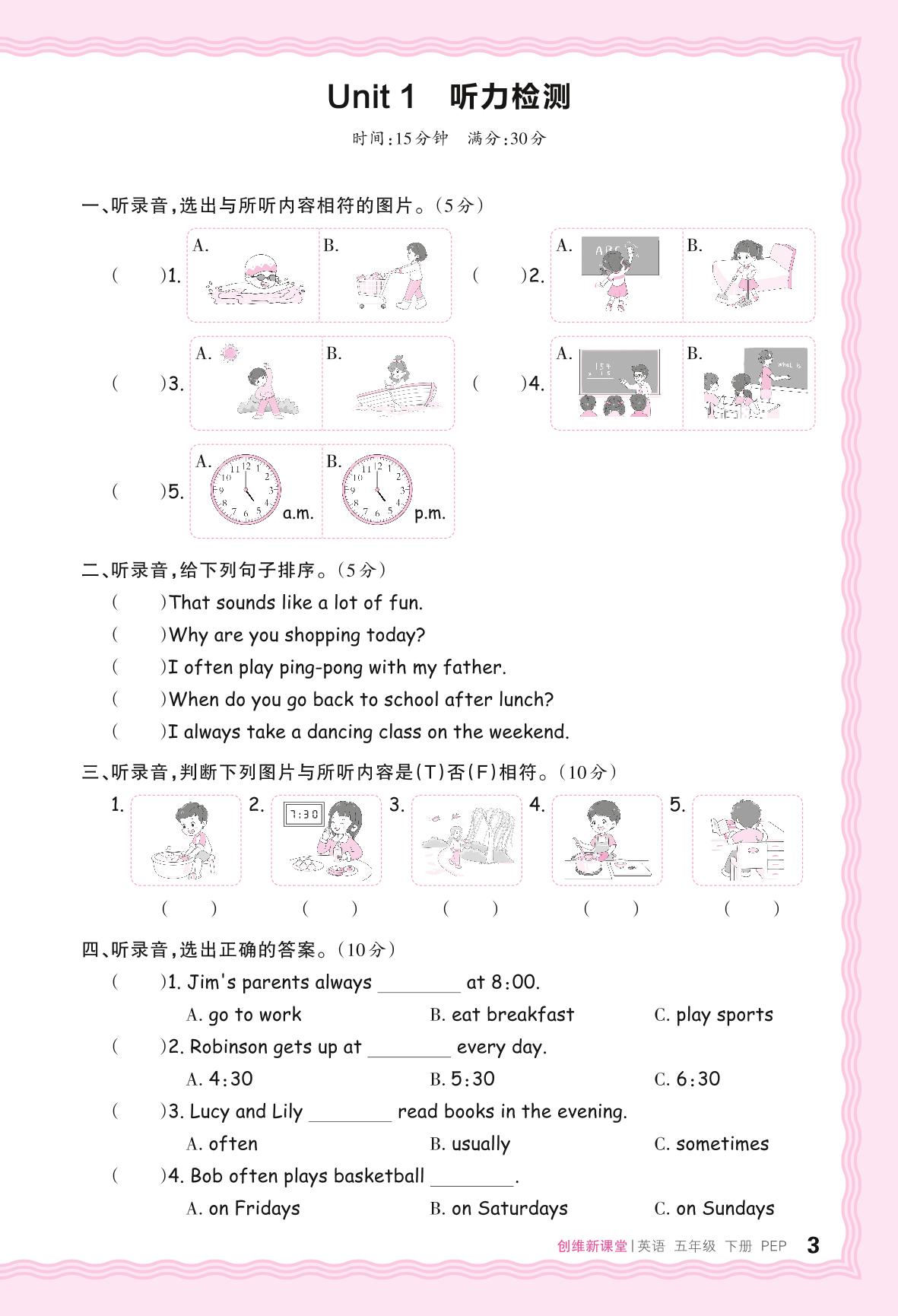 2024春下册五年级英语人教PEP版 Unit 1 听力检测