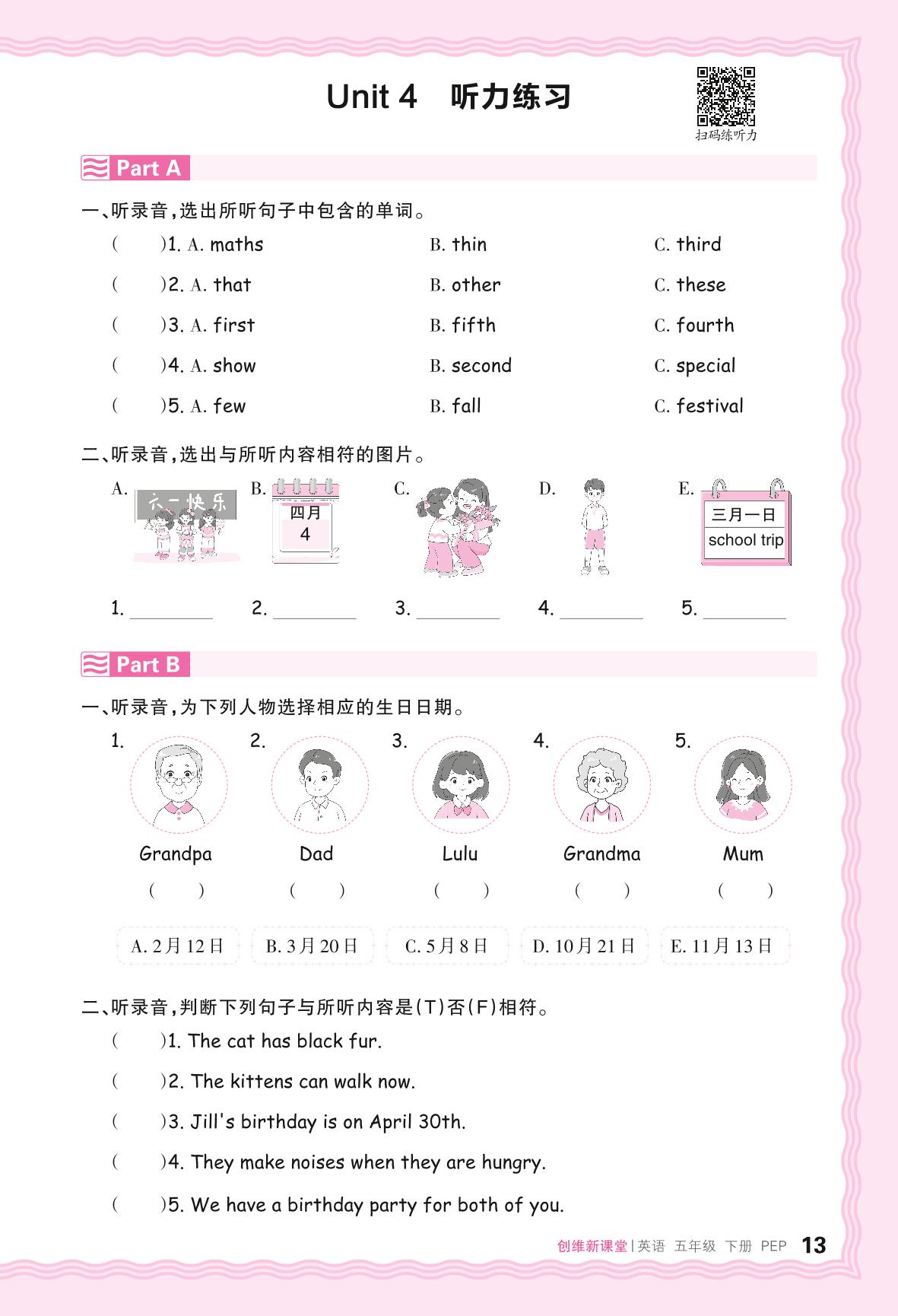 2024春下册五年级英语人教PEP版 Unit 4 听力练习