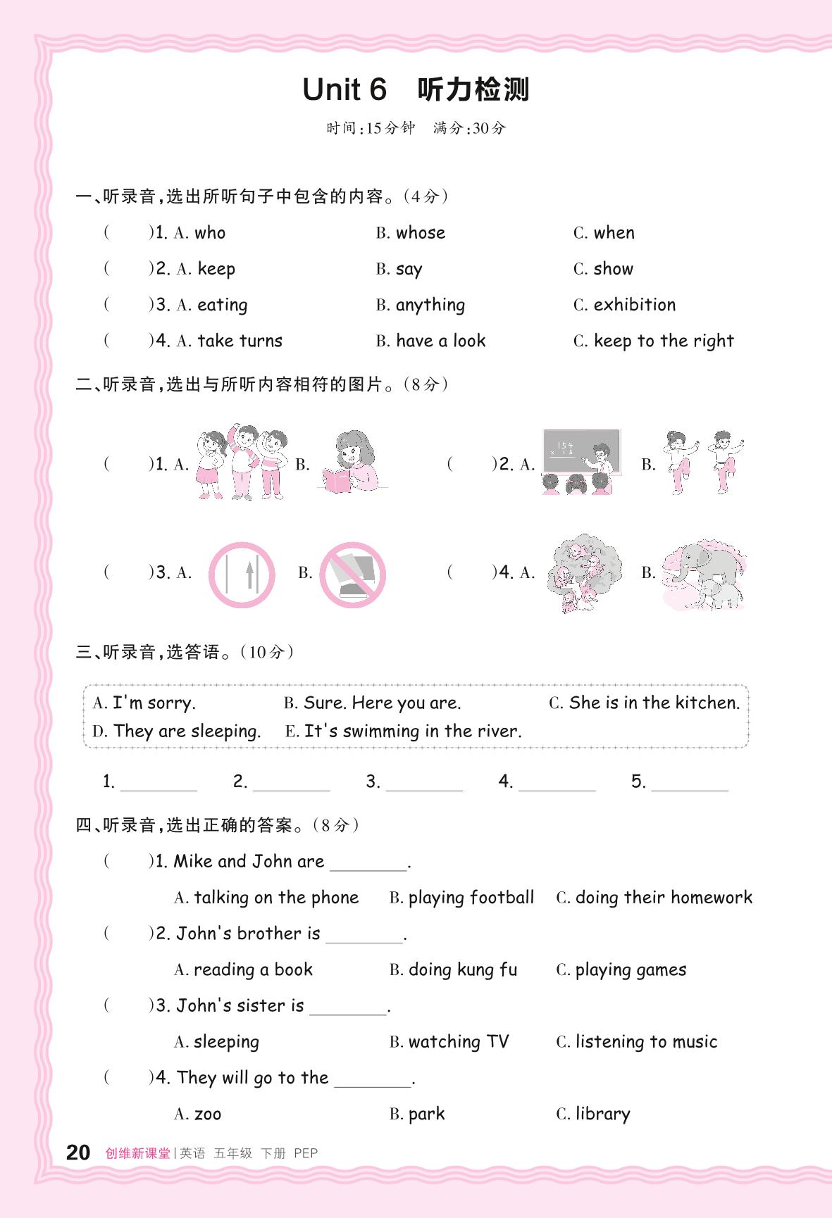2024春下册五年级英语人教PEP版 Unit 6 听力检测