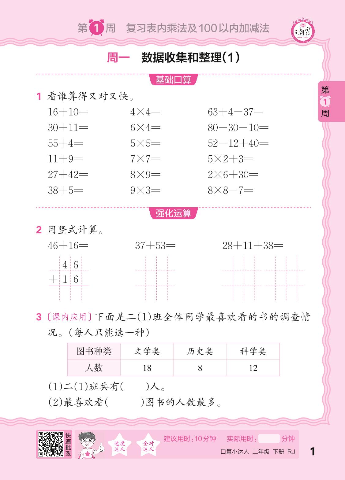 2024春下册二年级数学人教版 口算计算专练 第1周