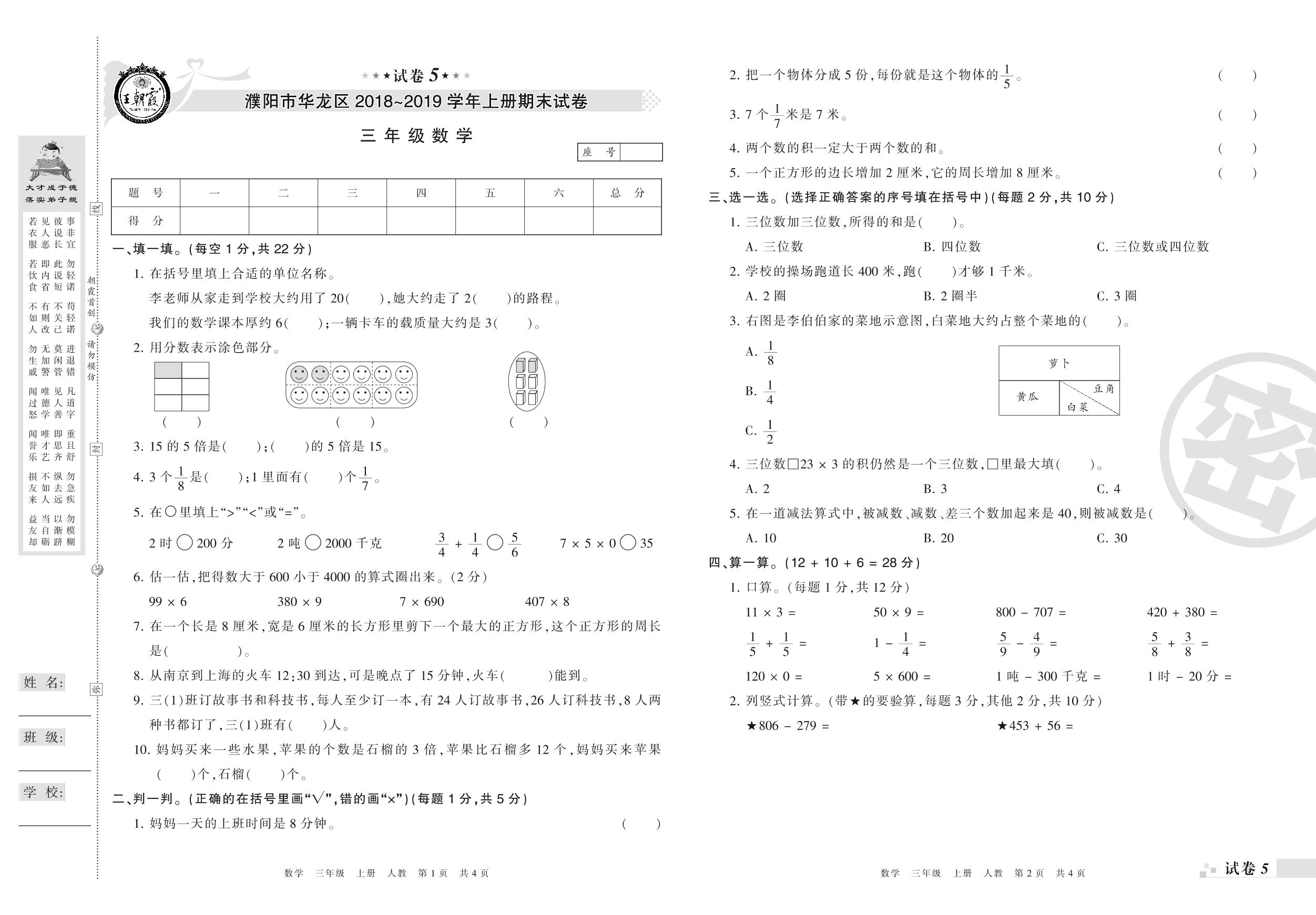 2018-2019学年第一学期濮阳市华龙区三年级数学试卷(人教版)【5】