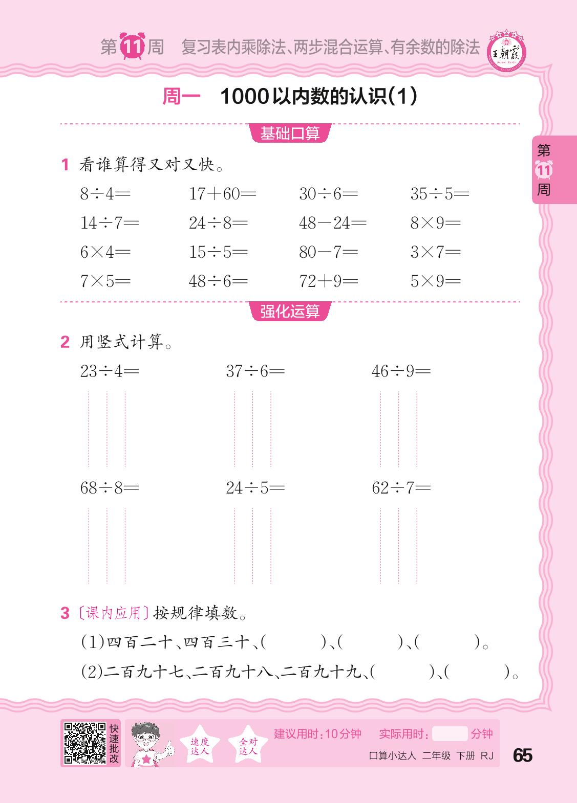 2024春下册二年级数学人教版 口算计算专练 第11周