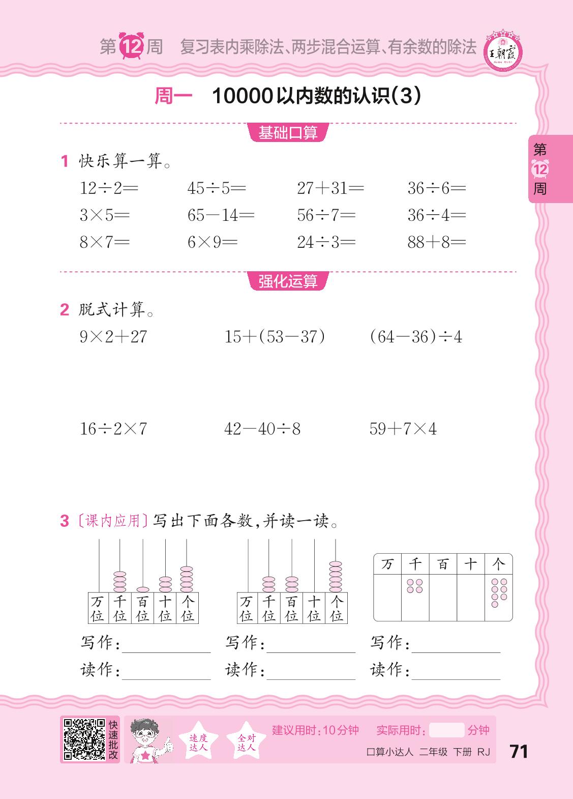 2024春下册二年级数学人教版 口算计算专练 第12周